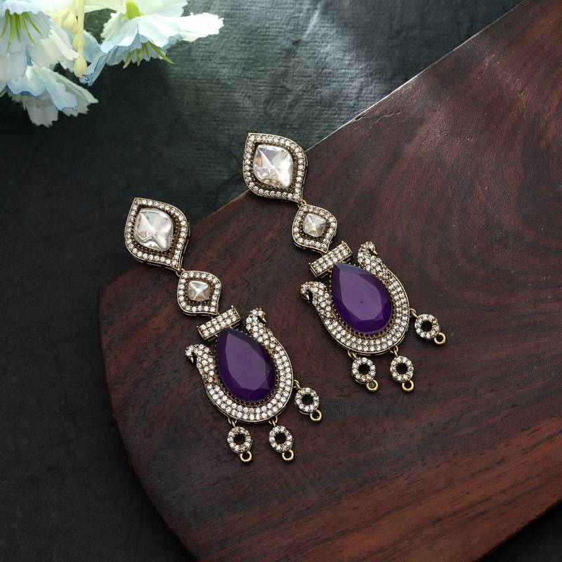 | Product Description | Earring Length: 7.50 Cm X Width: 2.10 Cm | Metal: Brass With Good Quality Apala Polish // Mehandi Gold Plated | Color: Purple | Stone: American Diamond & Monalisa Stone | Gross Weight: 29.00 Grams | Package Content: 1 Pair Of Earrings | Back Finding: Post With Friction Back X Earring Style: Dangle |