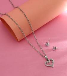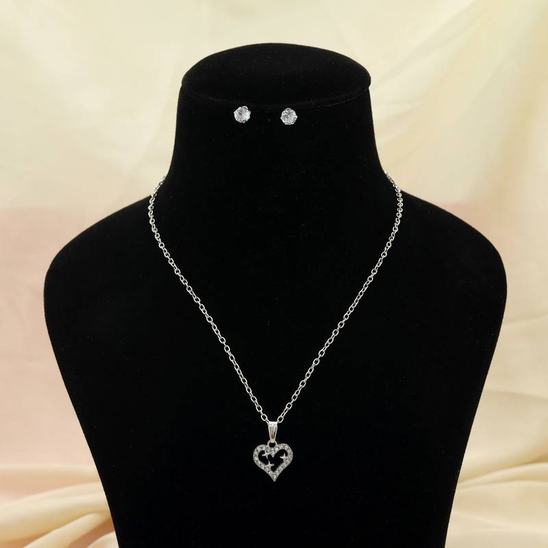 | Product Description | Chain Length: 40.00 Cm X Width: 0.20 Cm | Pendant Length: 1.60 Cm X Width: 1.50 Cm | Earring Length: 0.60 Cm X Width: 0.60 Cm | Metal: Alloy With Good Quality Silver Plated | Color: Silver | Stone: Rhinestone | Gross Weight: 7.00 Grams | Package Content: 1 Piece Of Necklace/ 1 Pair Of Earring | Back Finding: Post With Friction Back X Earring Style: Stud |