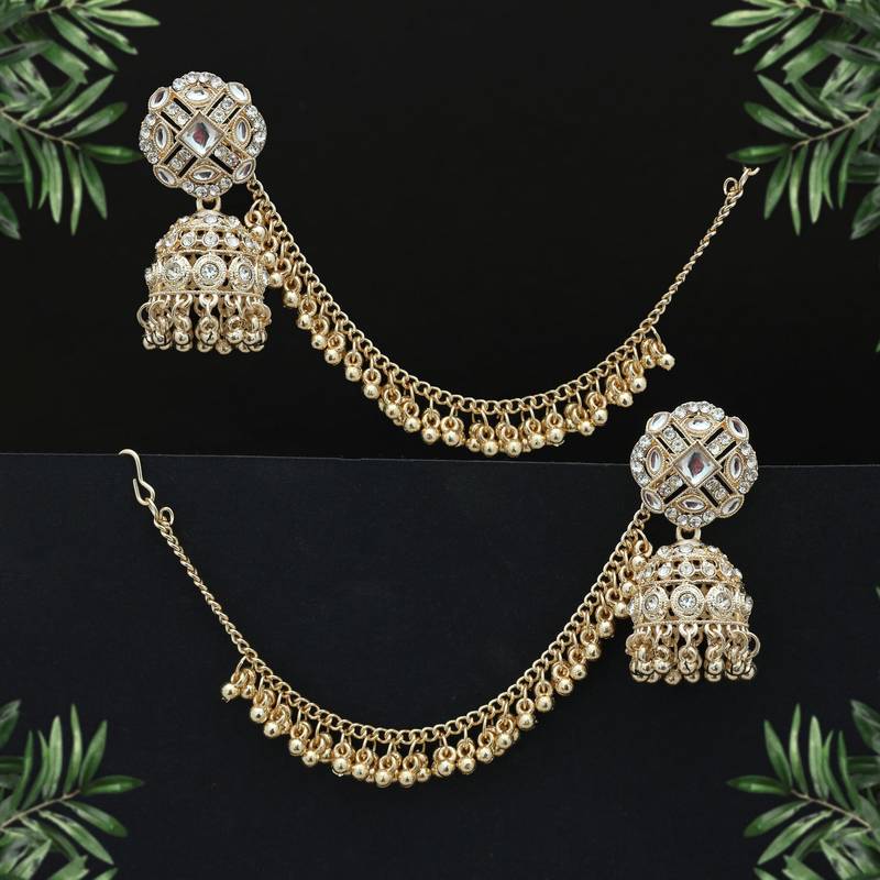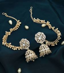 | Product Description | Chain Length: 16.00 Cm X Width: 1.10 Cm | Earring Length: 5.50 Cm X Width: 2.50 Cm | Metal: Alloy With Good Quality Gold Plated | Color: White | Stone: Kundan | Gross Weight: 43.00 Grams | Package Content: 1 Pair Of Earrings | Back Finding: Post With Friction Back X Earring Style: Jhumka |