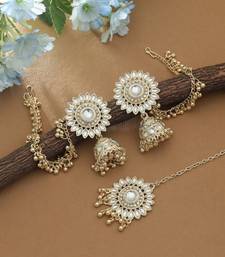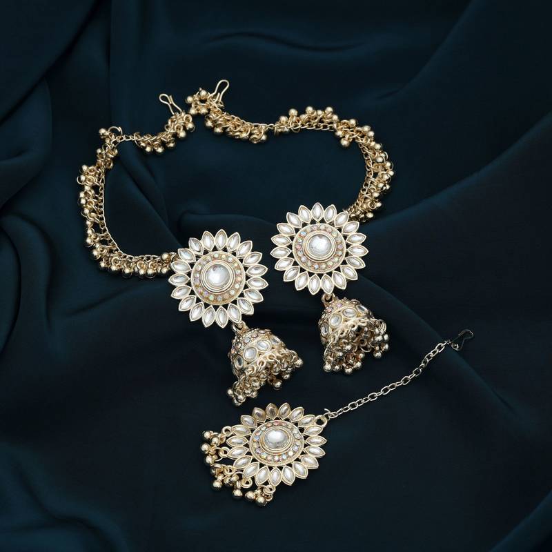 | Product Description | Chain Length: 14.00 Cm | Earring Length: 5.50 Cm X Width: 2.20 Cm | Maang Tikka Length: 11.00 Cm X Width: 3.50 Cm | Metal: Alloy With Good Quality Gold Plated | Color: White | Stone: Kundan | Gross Weight: 45.00 Grams | Package Content: 1 Pair Of Earrings/1 Piece Of Maang Tikka | Back Finding: Post With Friction Back X Earring Style: Jhumka |