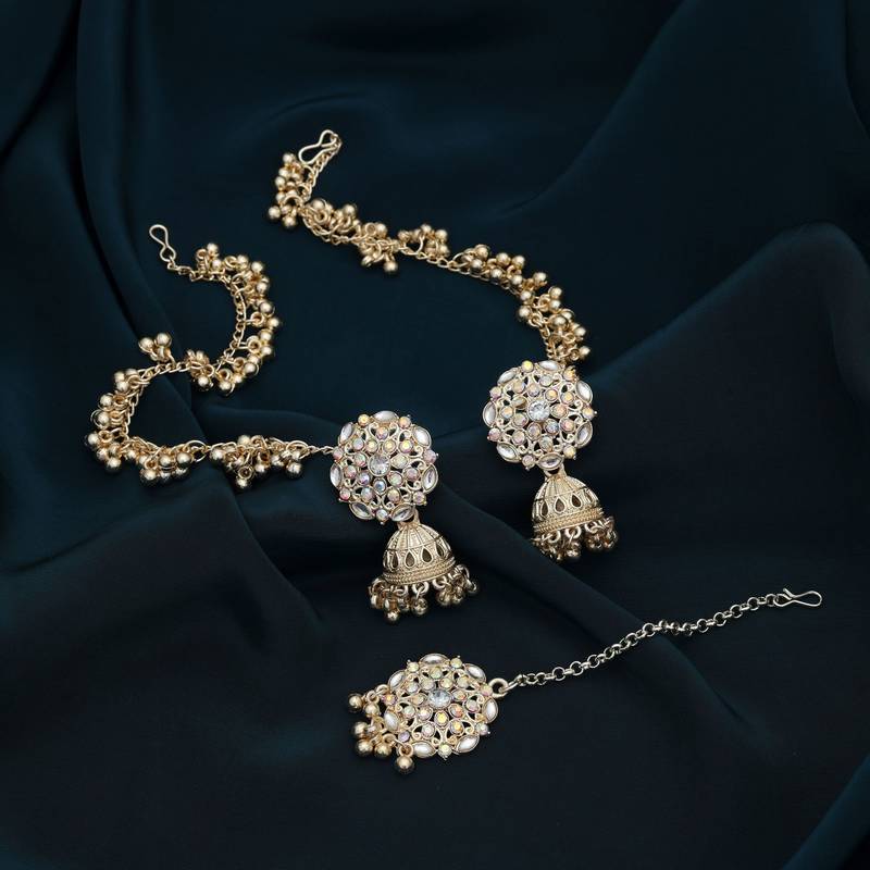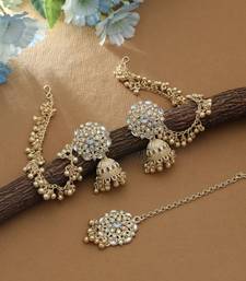 | Product Description | Chain Length: 14.00 Cm | Earring Length: 4.50 Cm X Width: 2.00 Cm | Maang Tikka Length: 11.00 Cm X Width: 2.50 Cm | Metal: Alloy With Good Quality Gold Plated | Color: White | Stone: Kundan | Gross Weight: 37.00 Grams | Package Content: 1 Pair Of Earrings/1 Piece Of Maang Tikka | Back Finding: Post With Friction Back X Earring Style: Jhumka |