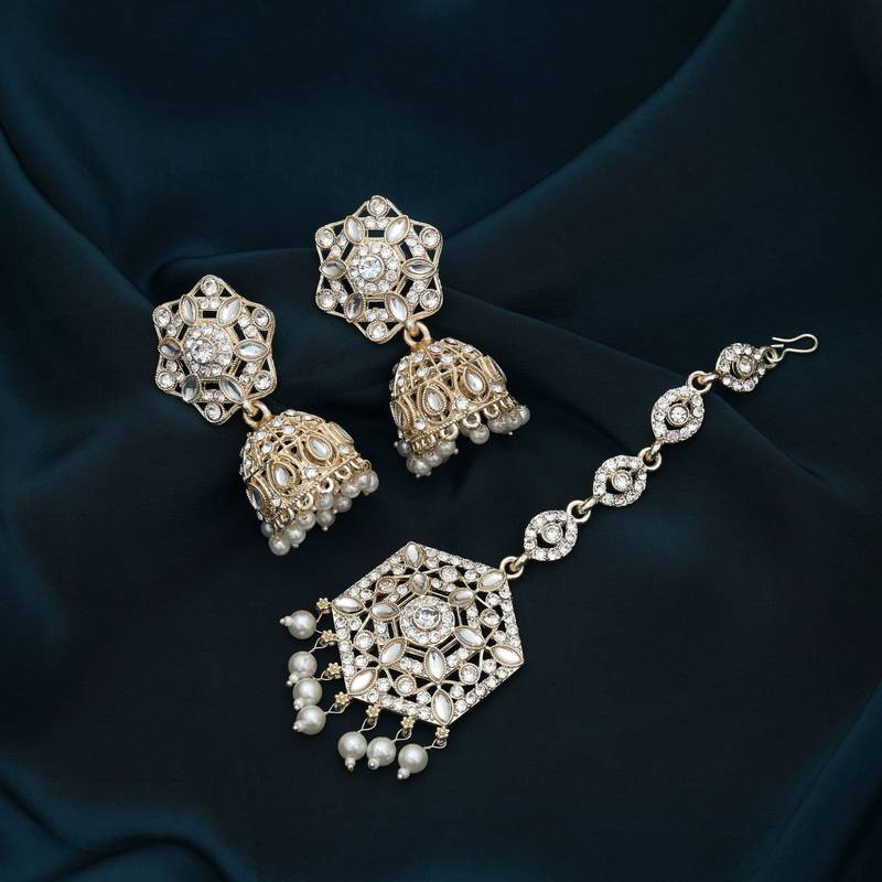 | Product Description | Earring Length: 5.20 Cm X Width: 2.40 Cm | Maang Tikka Length: 12.50 Cm X Width: 3.50 Cm | Metal: Alloy With Good Quality Gold Plated | Color: White | Stone: Kundan | Gross Weight: 43.00 Grams | Package Content: 1 Pair Of Earrings/1 Piece Of Maang Tikka | Back Finding: Post With Friction Back X Earring Style: Jhumka |