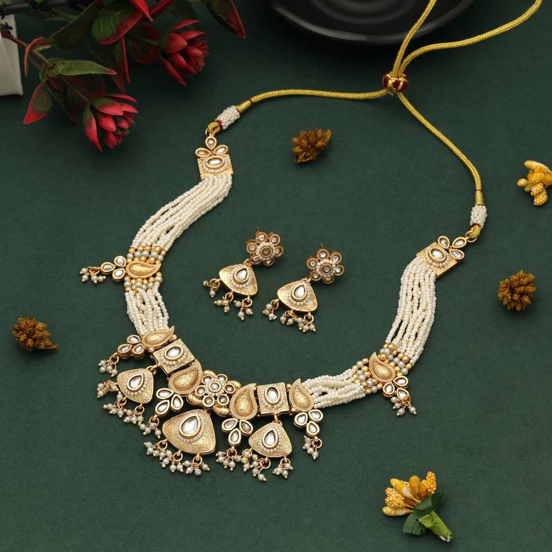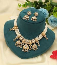 | Product Description | Adjustable Chain | Necklace Length: 26.00 Cm X Width: 4.40 Cm | Earring Length: 4.50 Cm X Width: 1.70 Cm | Metal: Alloy With Good Quality Matte Gold Plated | Color: White | Stone: Kundan | Gross Weight: 77.00 Grams | Package Content: 1 Piece Of Necklace/1 Pair Of Earrings | Back Finding: Post With Friction Back X Earring Style: Drop |