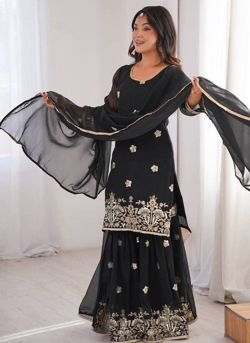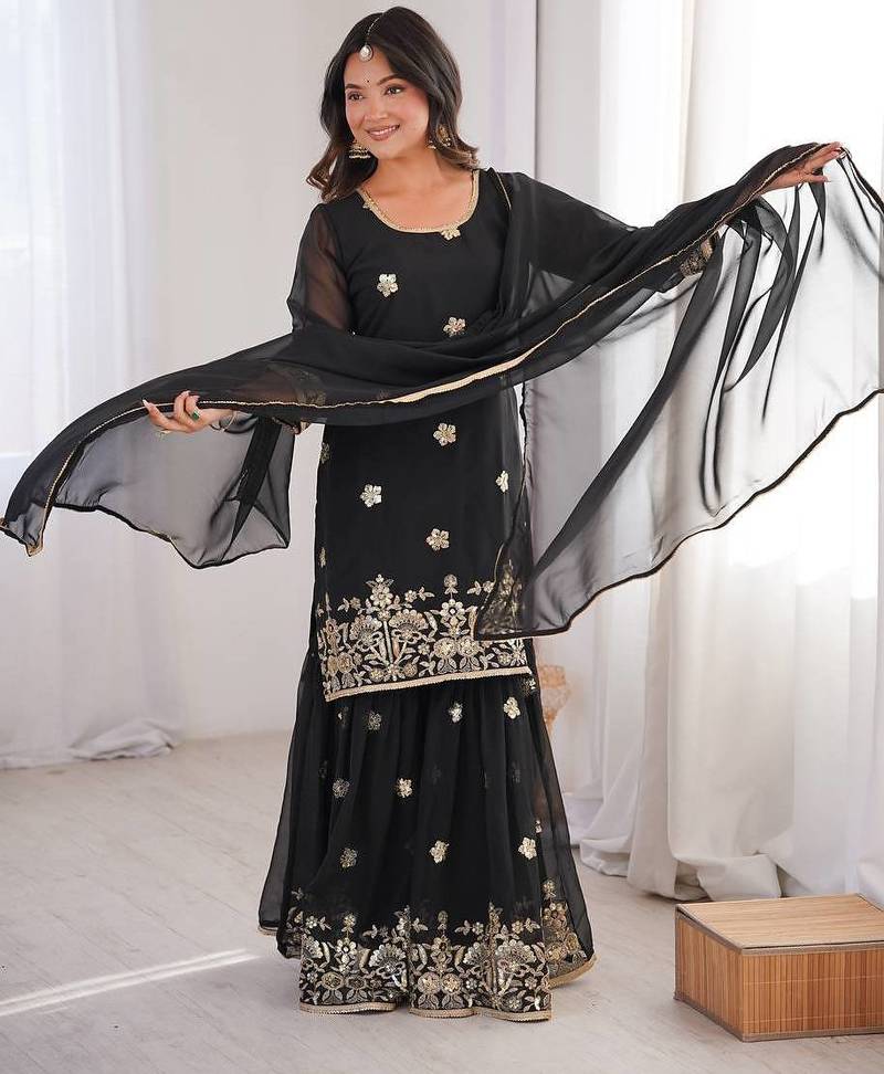 Fabric : Georgatte, Sarara:Georgatte , Work :Embroidery Work, Dupatta Fabric: Georgatte, Stitch : Full Stitched With Elastic Bottom