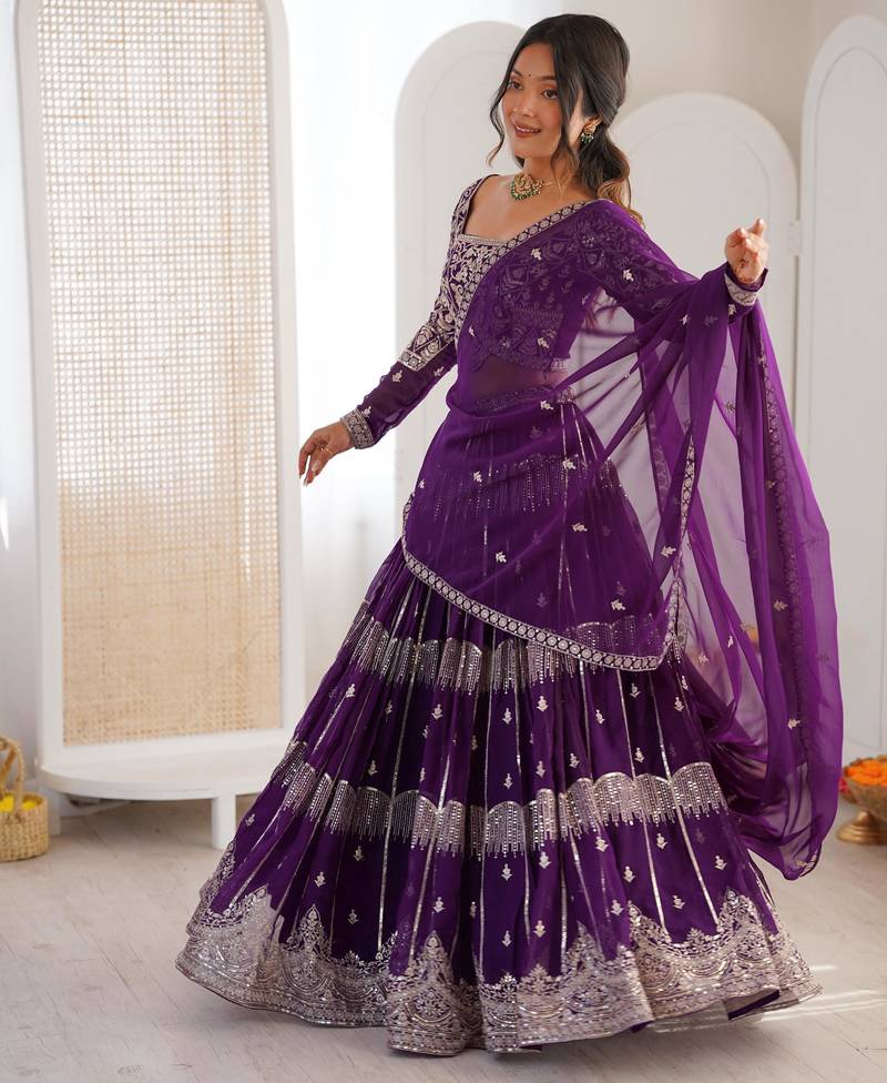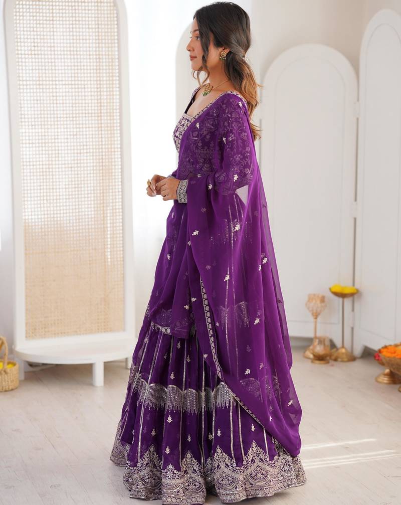 | Product Description | Step Into Elegance With This Royal Purple Lehenga Choli Set, Designed To Make You Stand Out At Every Special Occasion. Crafted From Flowy Faux Georgette, The Ensemble Features Exquisite Silver Thread And Sequin Embroidery That Adds A Rich, Luminous Appeal To The Outfit.