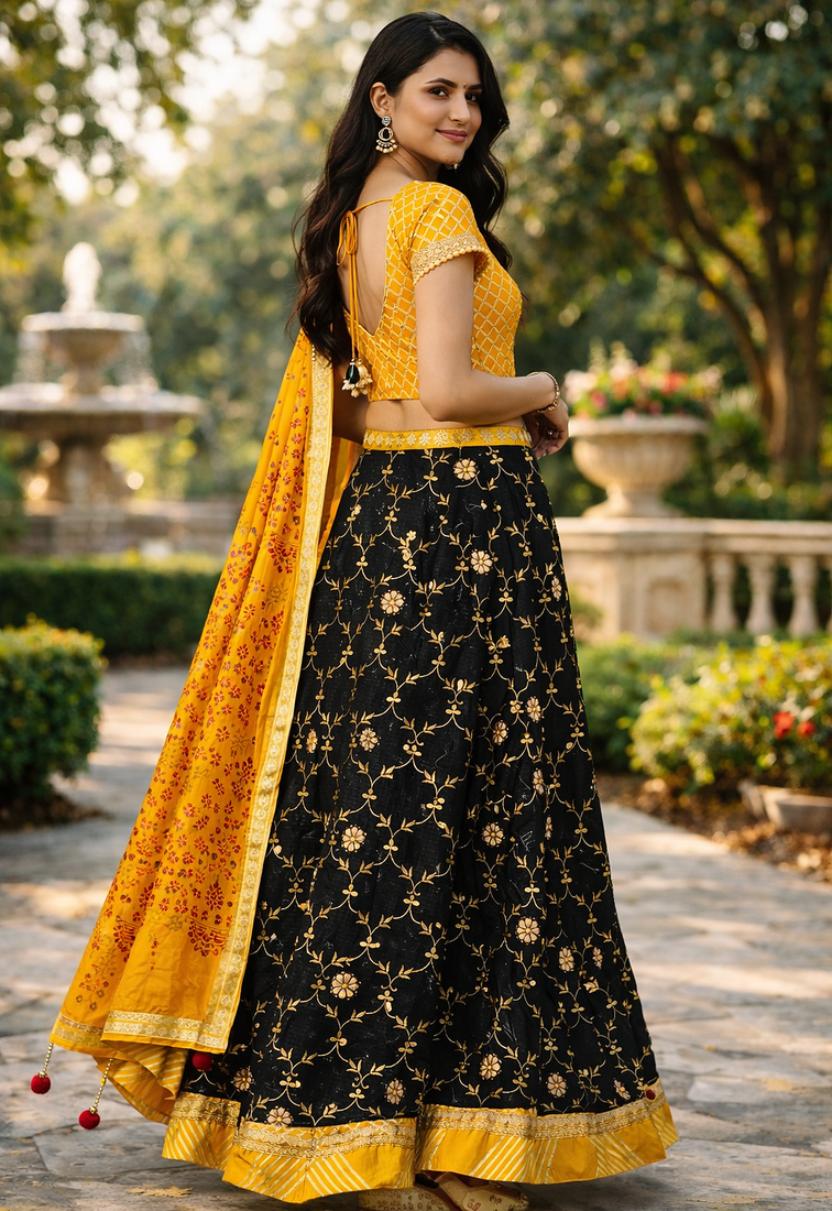 Black hand embroidered kota silk sustainable lehenga with yellow bandhani dupatta