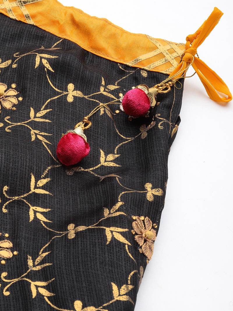| Product Name | Black Hand Embroidered Kota Silk Sustainable Lehenga With Yellow Bandhani Dupatta | |