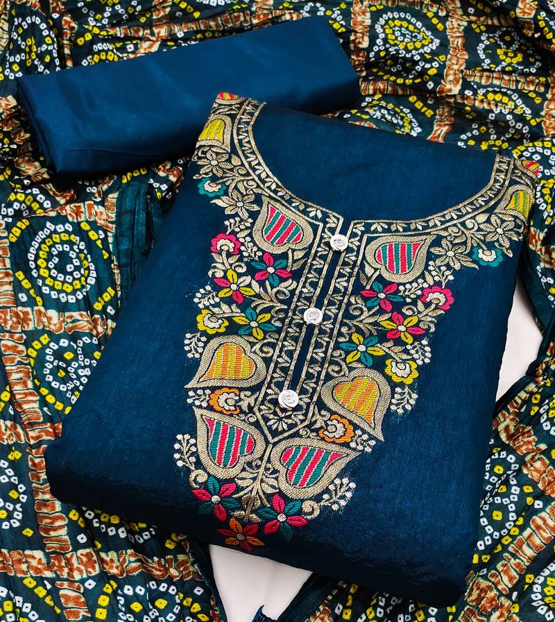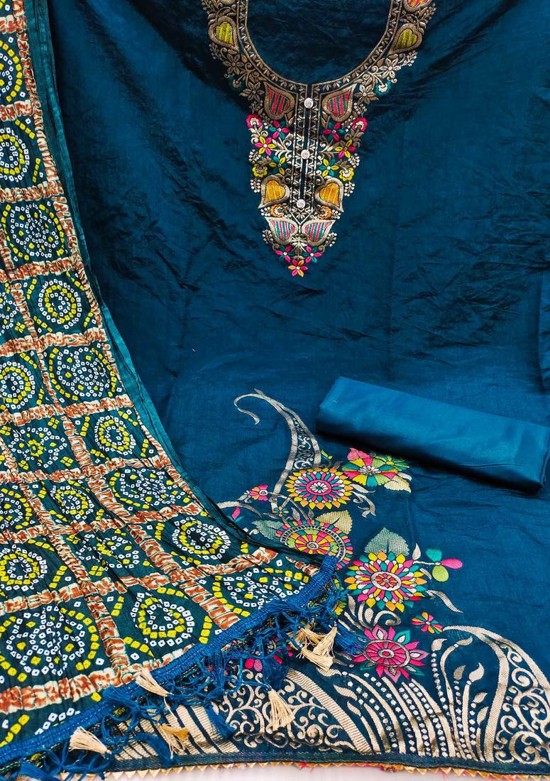 | Product Description | Embrace The Timeless Beauty Of Banarasi Craftsmanship With Our Exclusive Dress Material Suit For Women. The Top Fabric Features Exquisite Banarasi Meenakari Jacquard, Showcasing Intricate Patterns And Designs. Paired With Comfortable Santoon For The Bottom, And Complemented By A Chinnon Bandhani Print Dupatta, This Ensemble Is A Perfect Blend Of Tradition And Style. Elevate Your Ethnic Wardrobe With The Rich Heritage And Elegance Of Banarasi Meenakari Jacquard Work. |