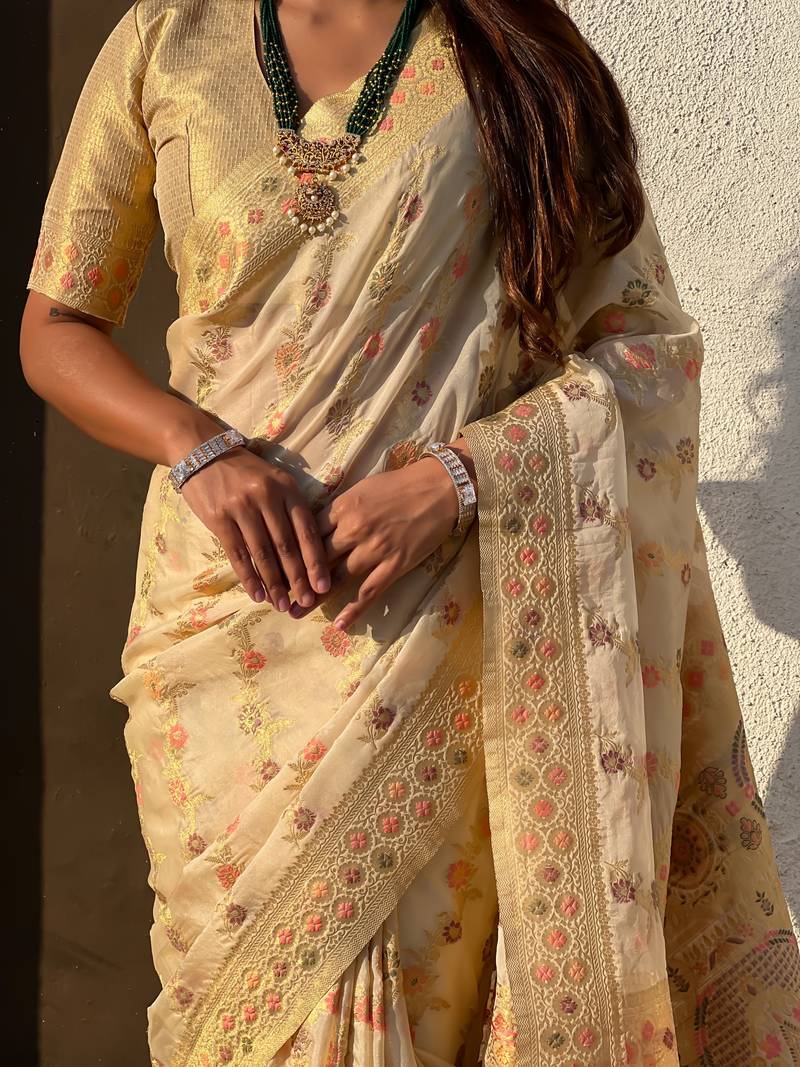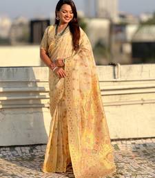 Beige woven zari floral & traditional motifs work silk blend fabric traditional festive style