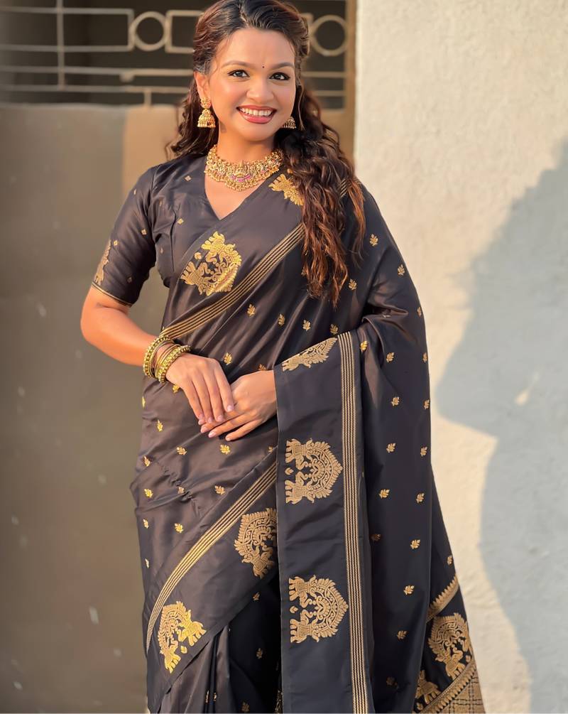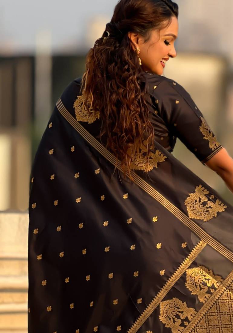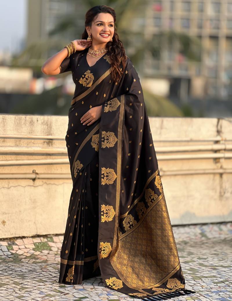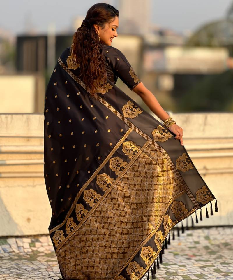 Black silk blend saree with golden zari motifs & ribl woven pallu | traditional festive wear saree