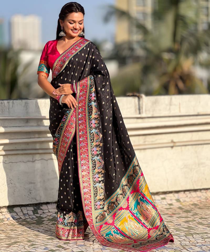 | Product Name | Black Silk Blend Saree With Traditional Multicolor Woven Border & Rich Pallu | Festive & Party Wear Saree | |