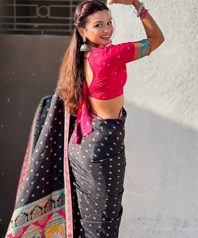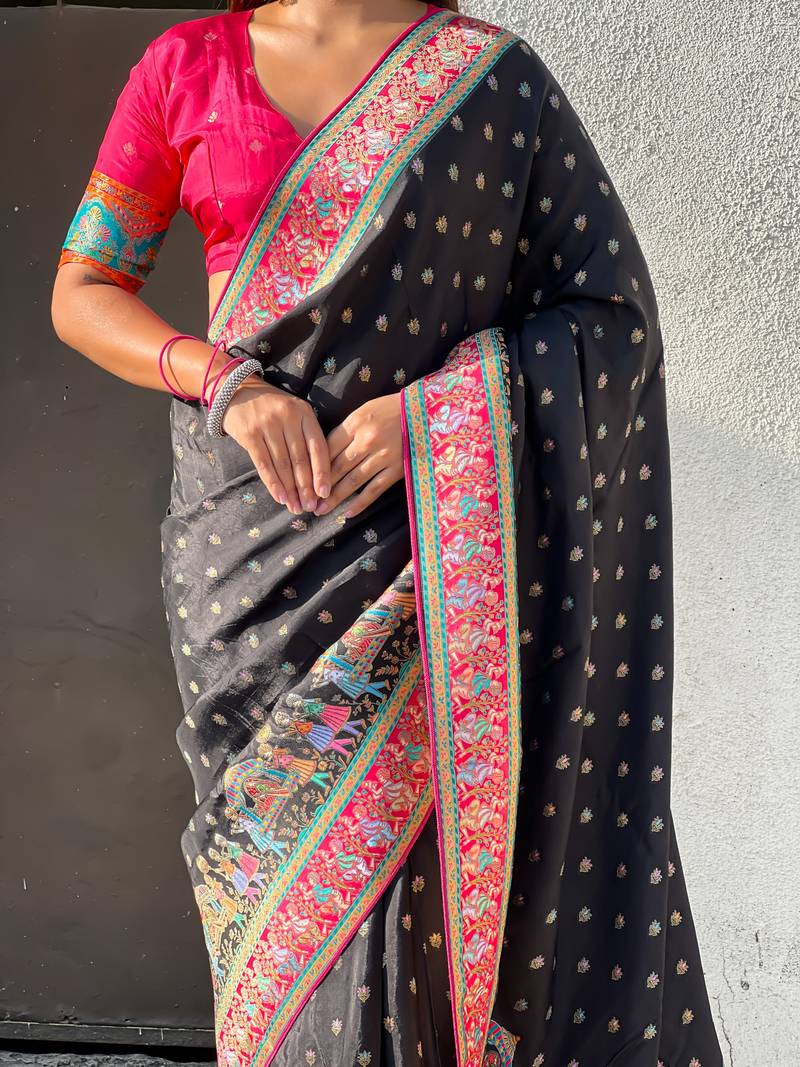 | Product Description | This Stunning Black Silk Blend Saree Is A Perfect Blend Of Elegance And Traditional Artistry. Adorned With Subtle Golden Buti Motifs Across The Body, It Exudes A Refined Charm. The Highlight Of The Saree Is Its Vibrant Multicolor Woven Border And Richly Designed Pallu, Featuring Intricate Ethnic Patterns That Add A Regal Touch. The Contrast Blouse Enhances Its Overall Appeal, Making It Ideal For Festive Celebrations, Weddings, And Cultural Events. Lightweight Yet Luxurious, This Saree Ensures Graceful Draping And All Day Comfort. Pair It With Statement Jewelry To Create A Timeless And Sophisticated Ethnic Look. |