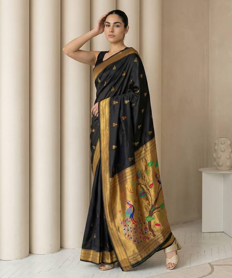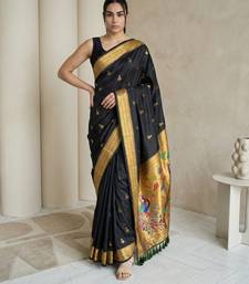 Black woven zari buti & peacock pallu work silk blend fabric traditional festive style paithani style saree