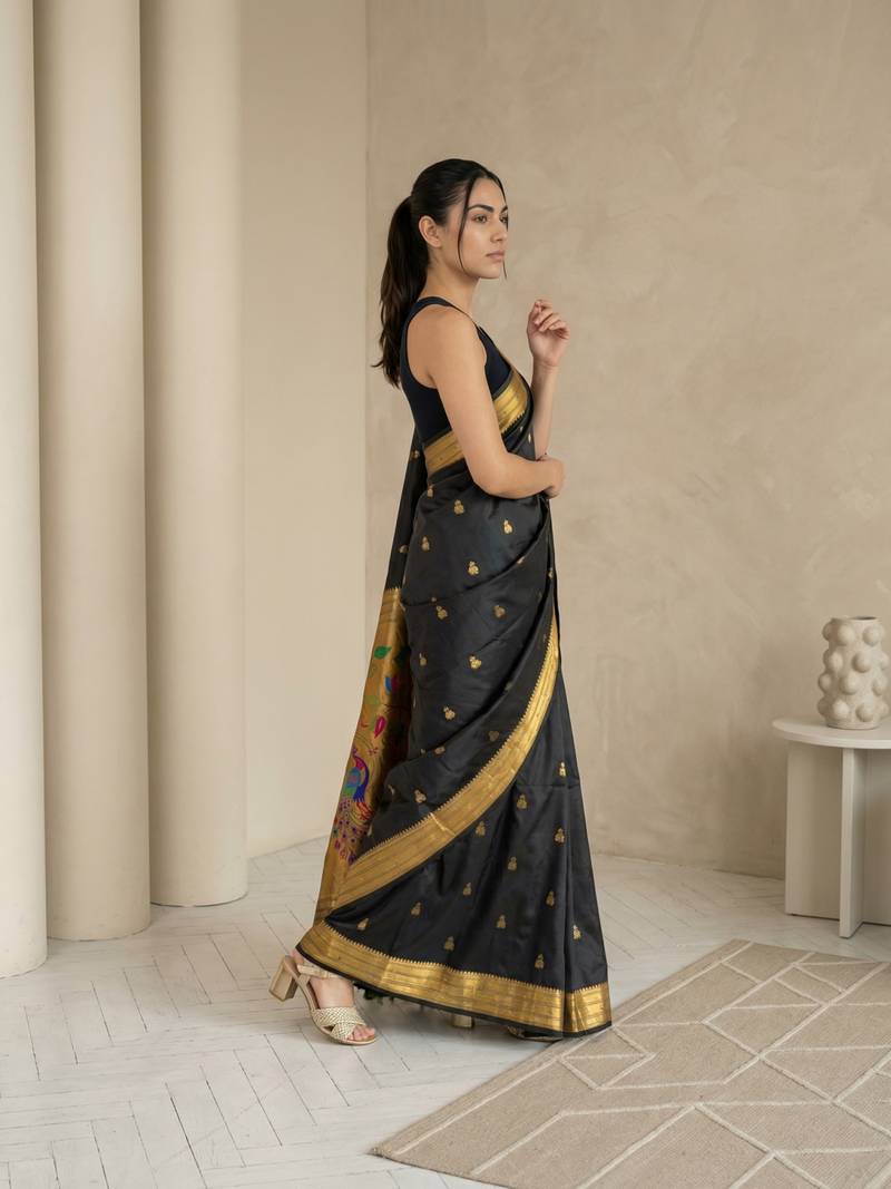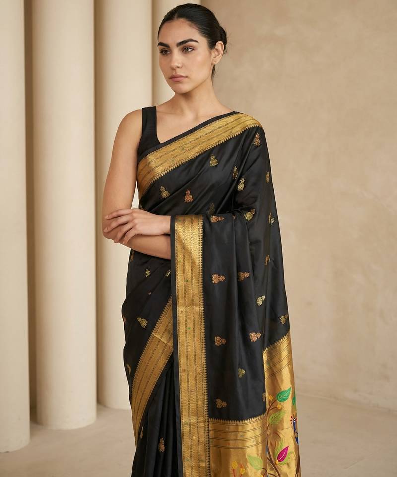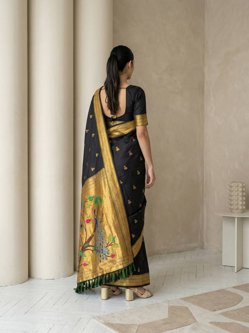 | Product Name | Black Woven Zari Buti & Peacock Pallu Work Silk Blend Fabric Traditional Festive Style Paithani Style Saree | |