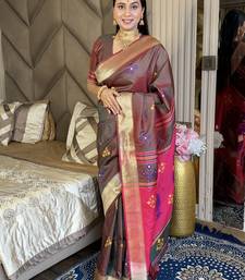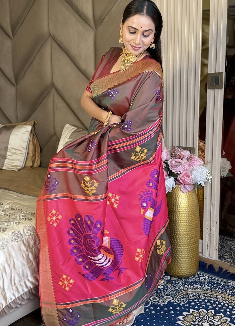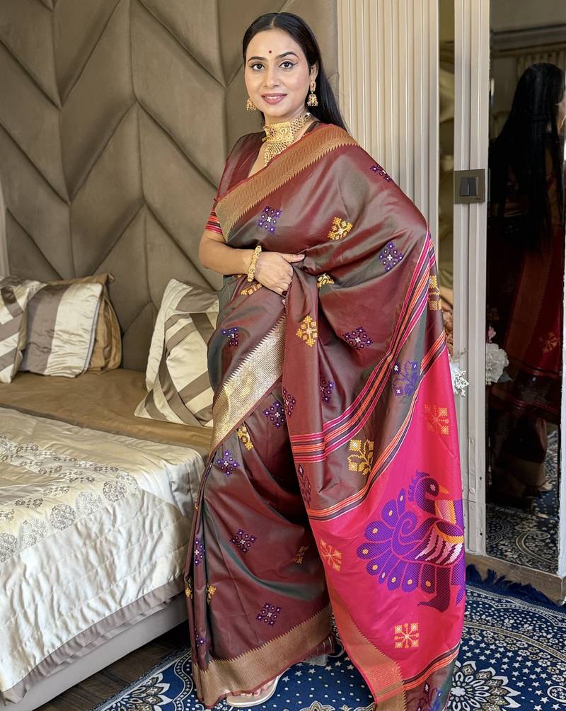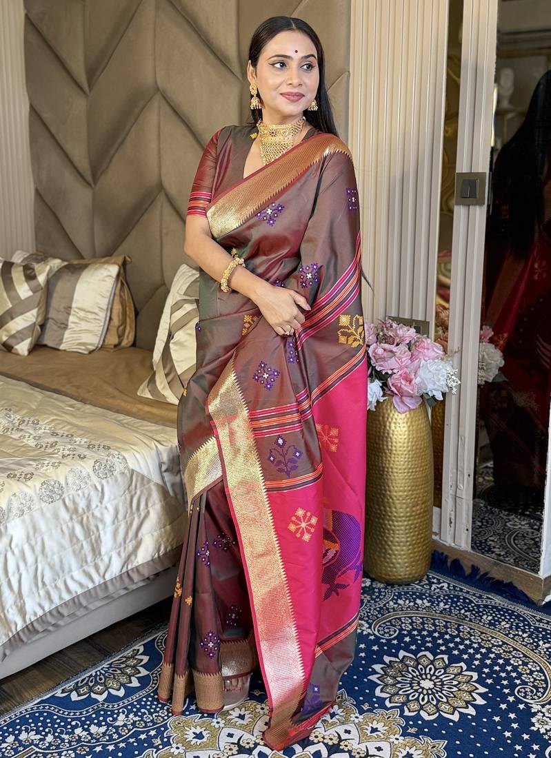 Chocolate woven zari buti & peacock pallu work silk blend fabric traditional festive style paithani style saree