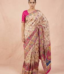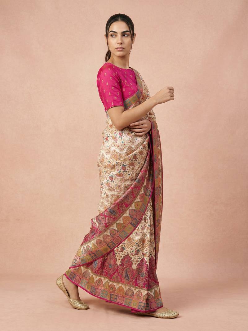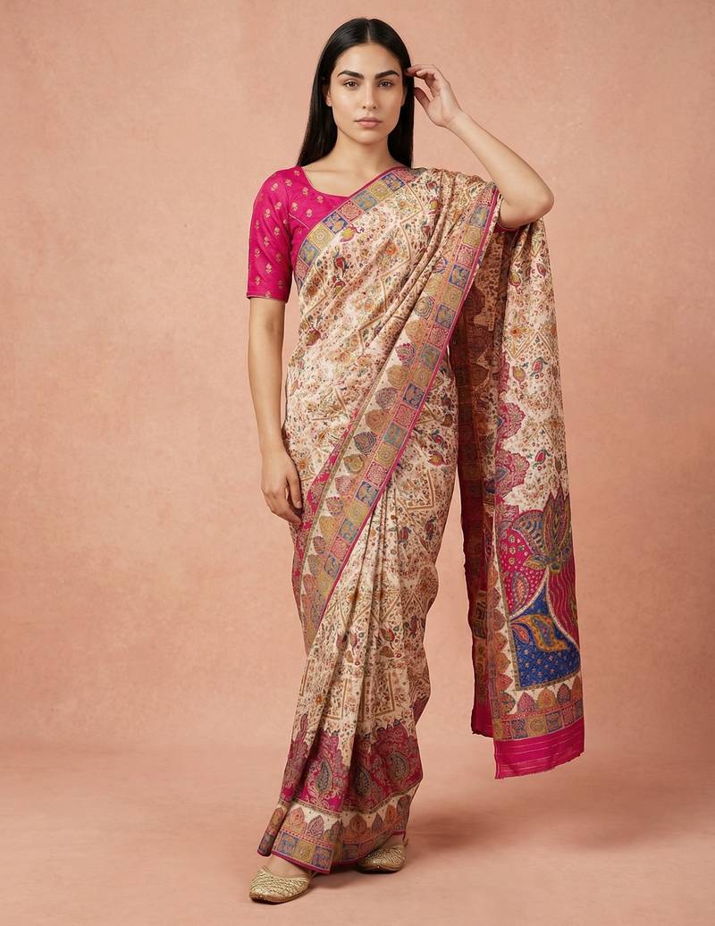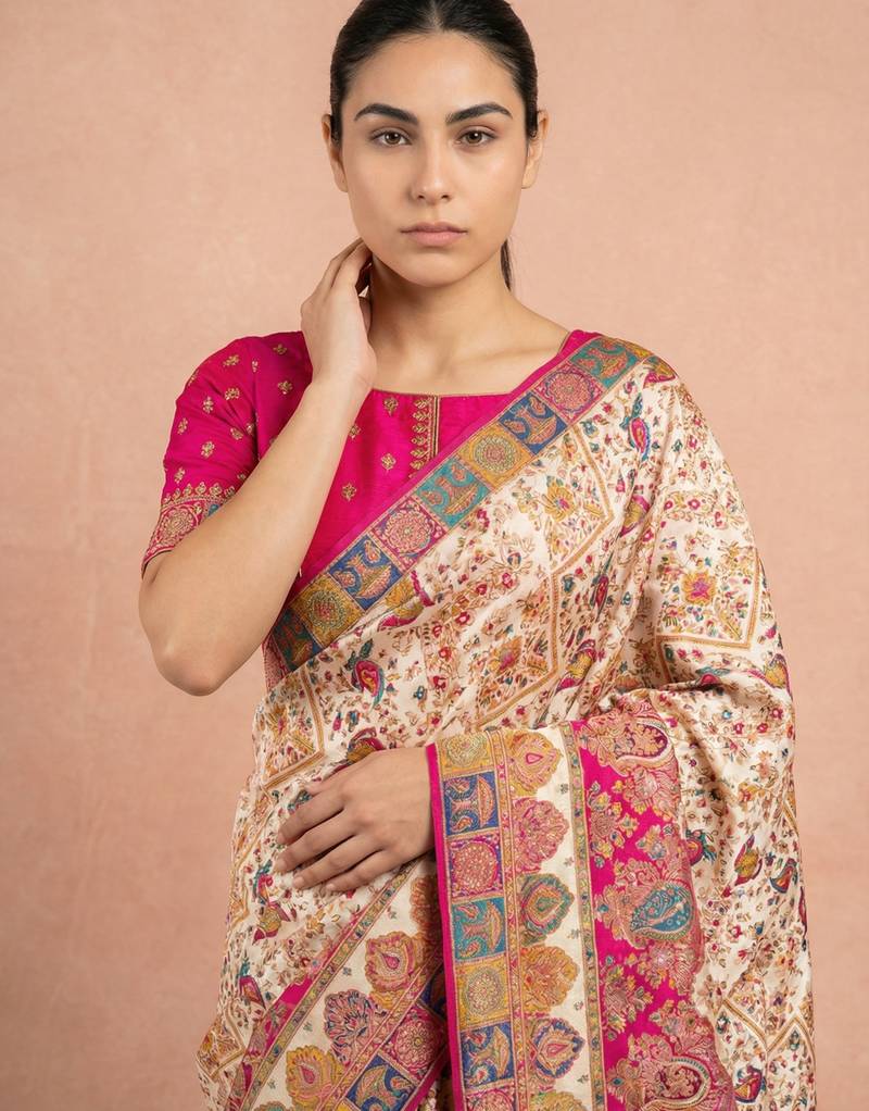 Cream printed silk blend saree with multicolor traditional border & paisley pallu | festive ethnic wear saree