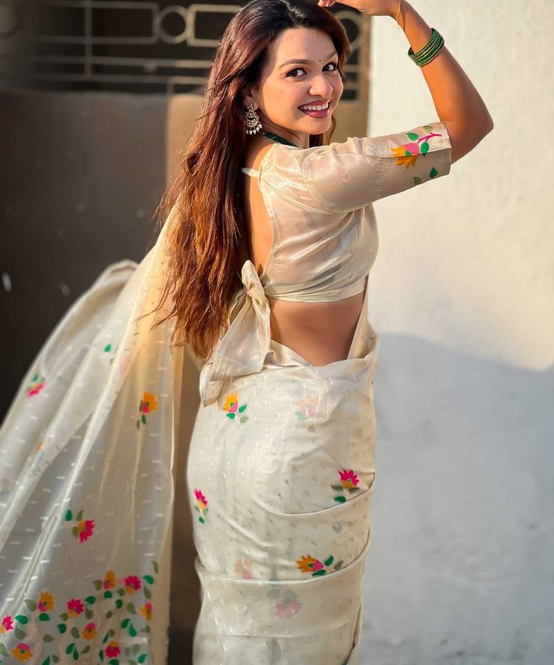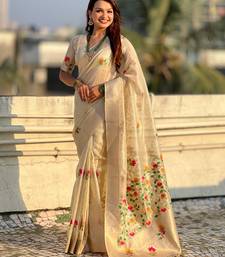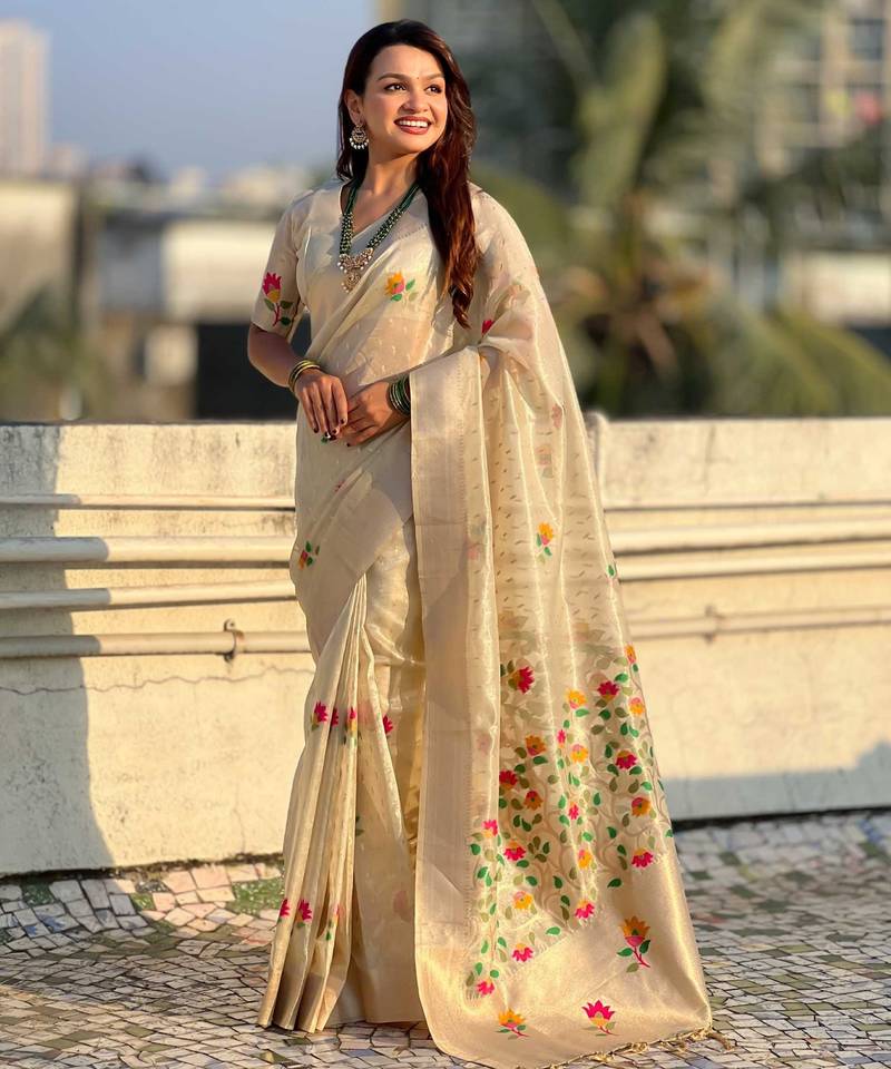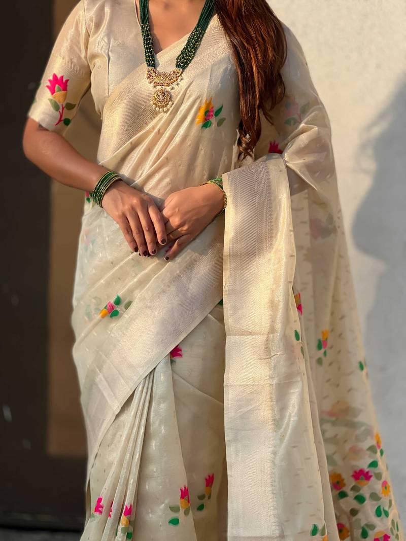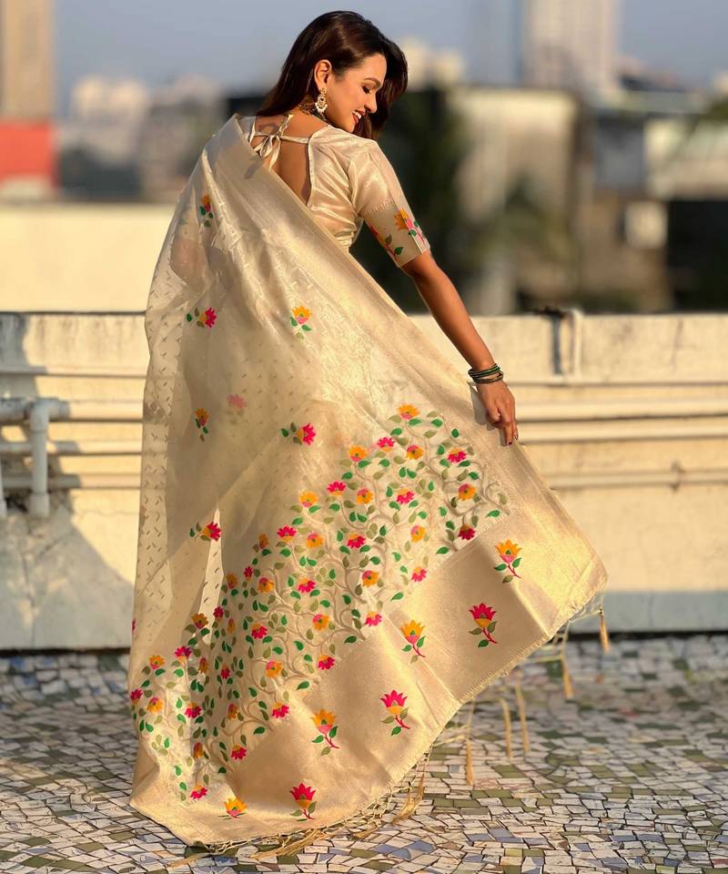 Cream with multicolor accents woven zari floral motifs work paithani style saree