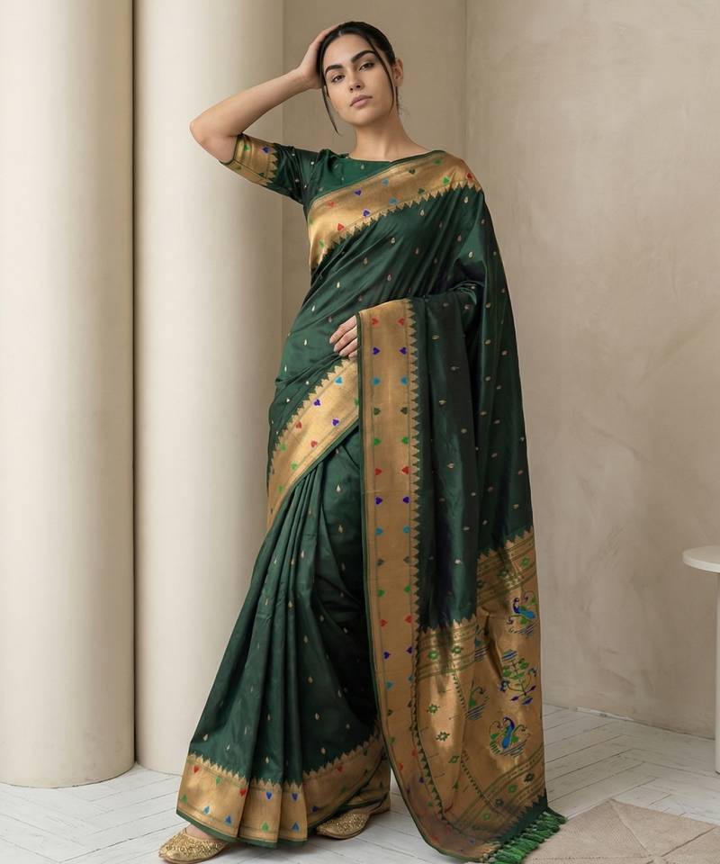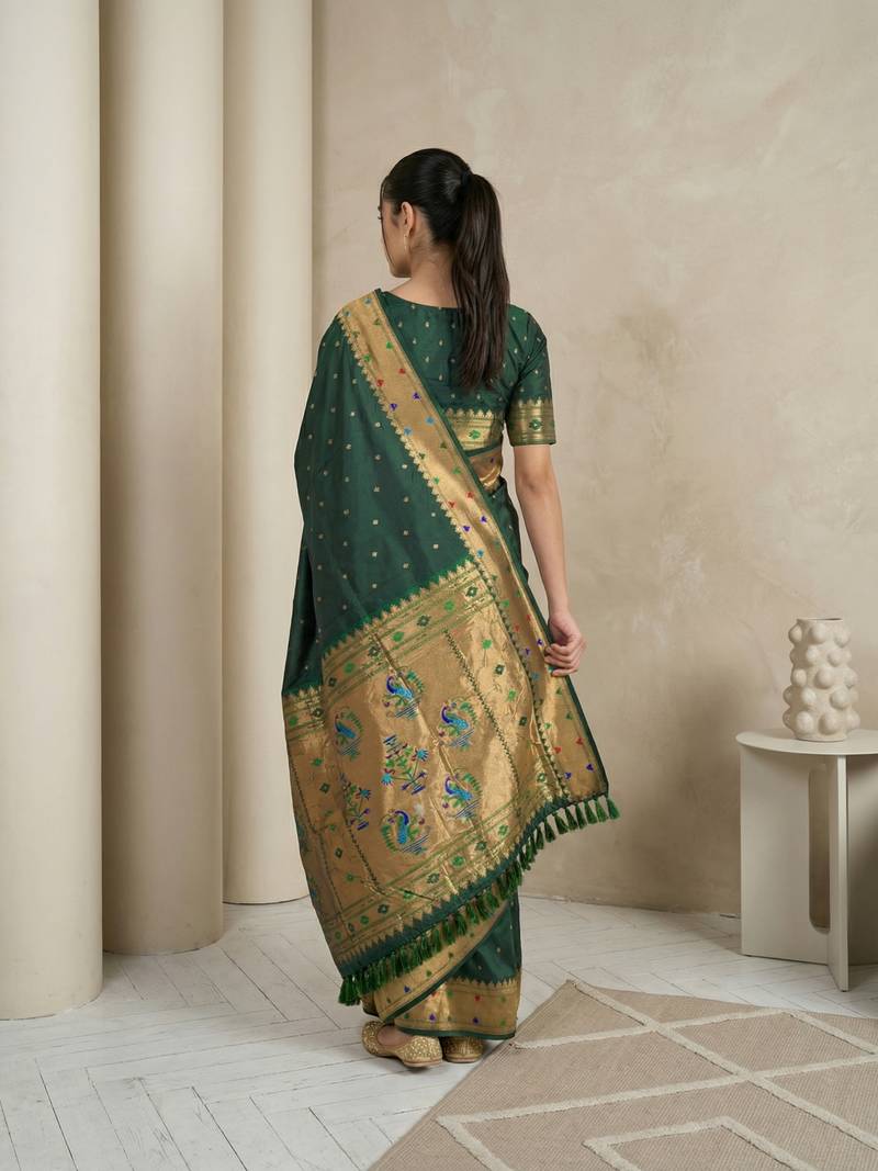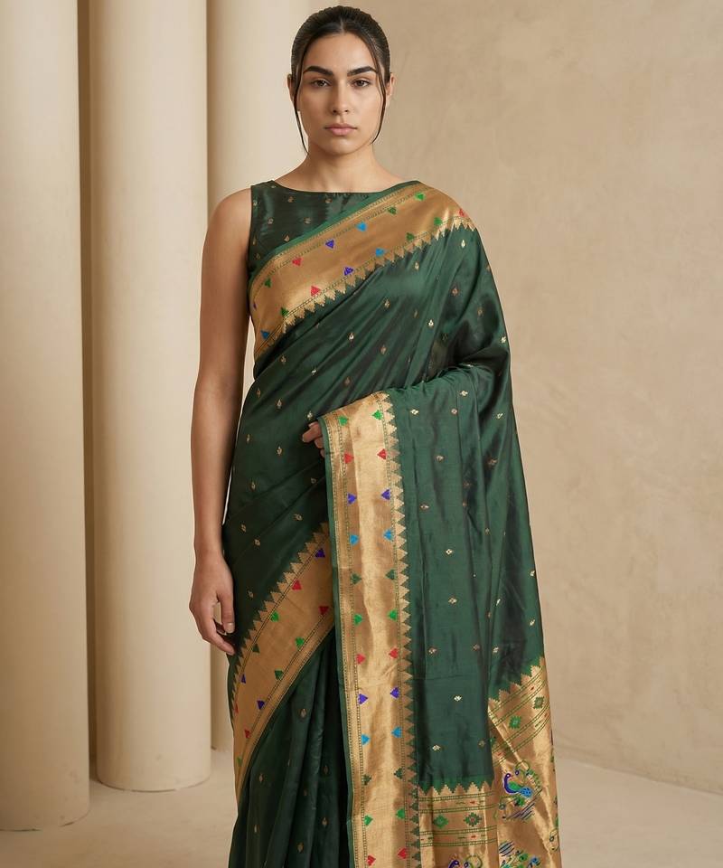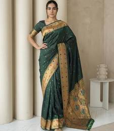 | Product Name | Dark Green With Gold Border Contrast Traditional Peacock & Triangle Motifs Work Silk Blend Fabric | |