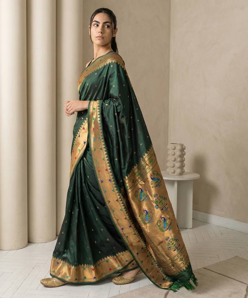 Dark green with gold border contrast traditional peacock & triangle motifs work silk blend fabric