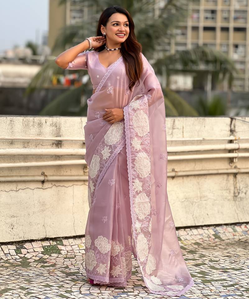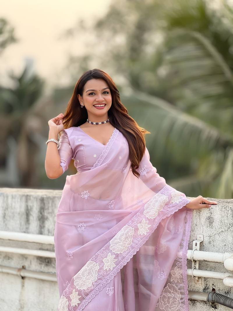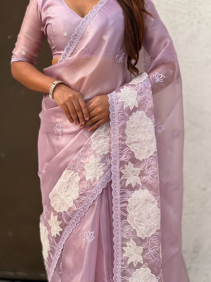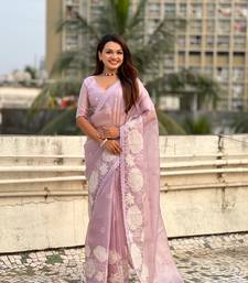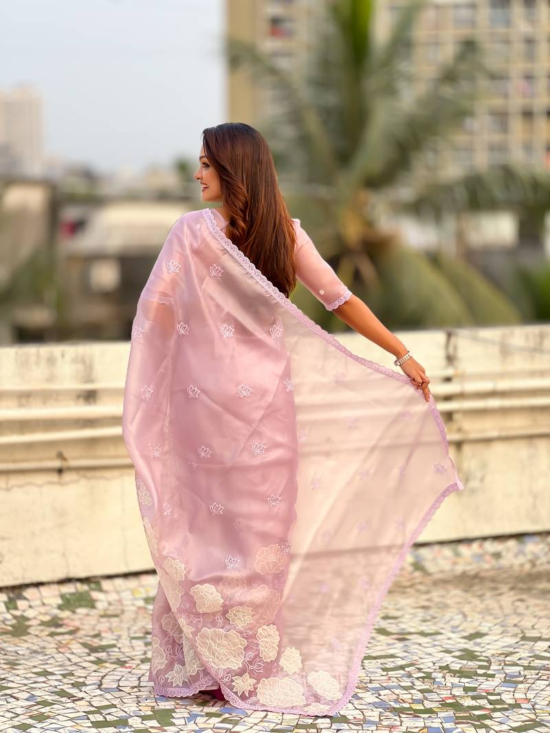 Dusty pink thread embroidery floral work organza elegant party wear style designer saree with blouse piece