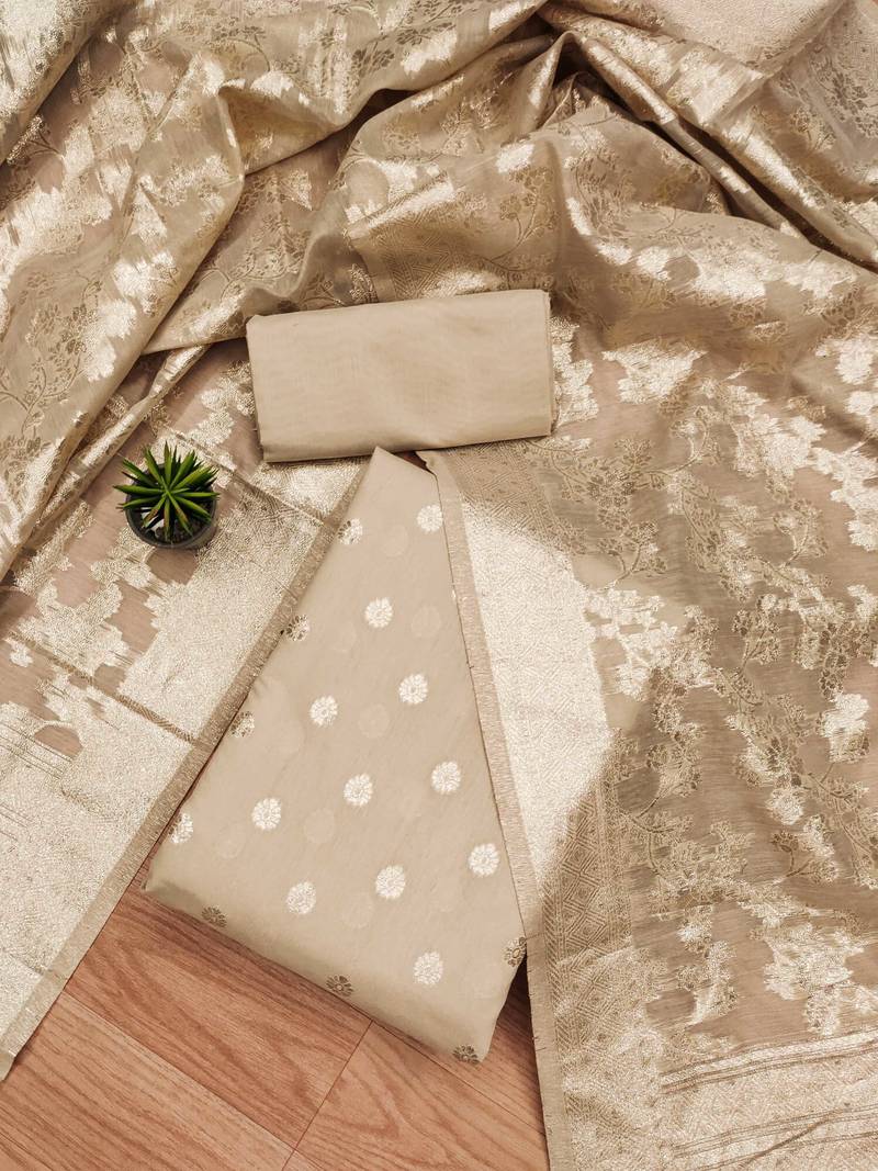 | Product Description | Elegant Chanderi Cotton Spun Ensemble Featuring Mx Zari Accents, Comprising A 2.50 Meter Top Fabric, 2.40 Meter Bottom Fabric, And A 2.25 Meter Dupatta, Perfect For A Graceful And Sophisticated Look. |