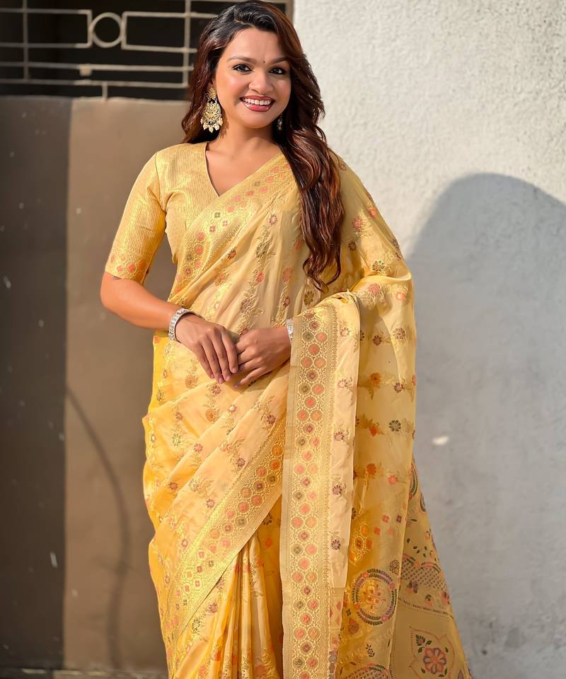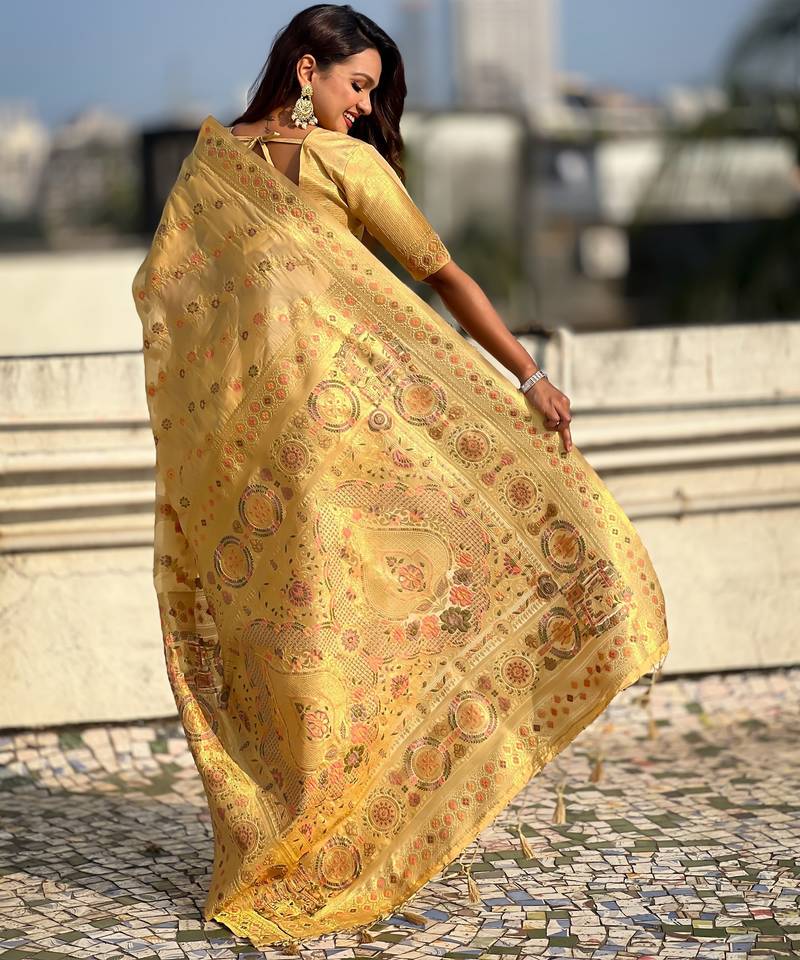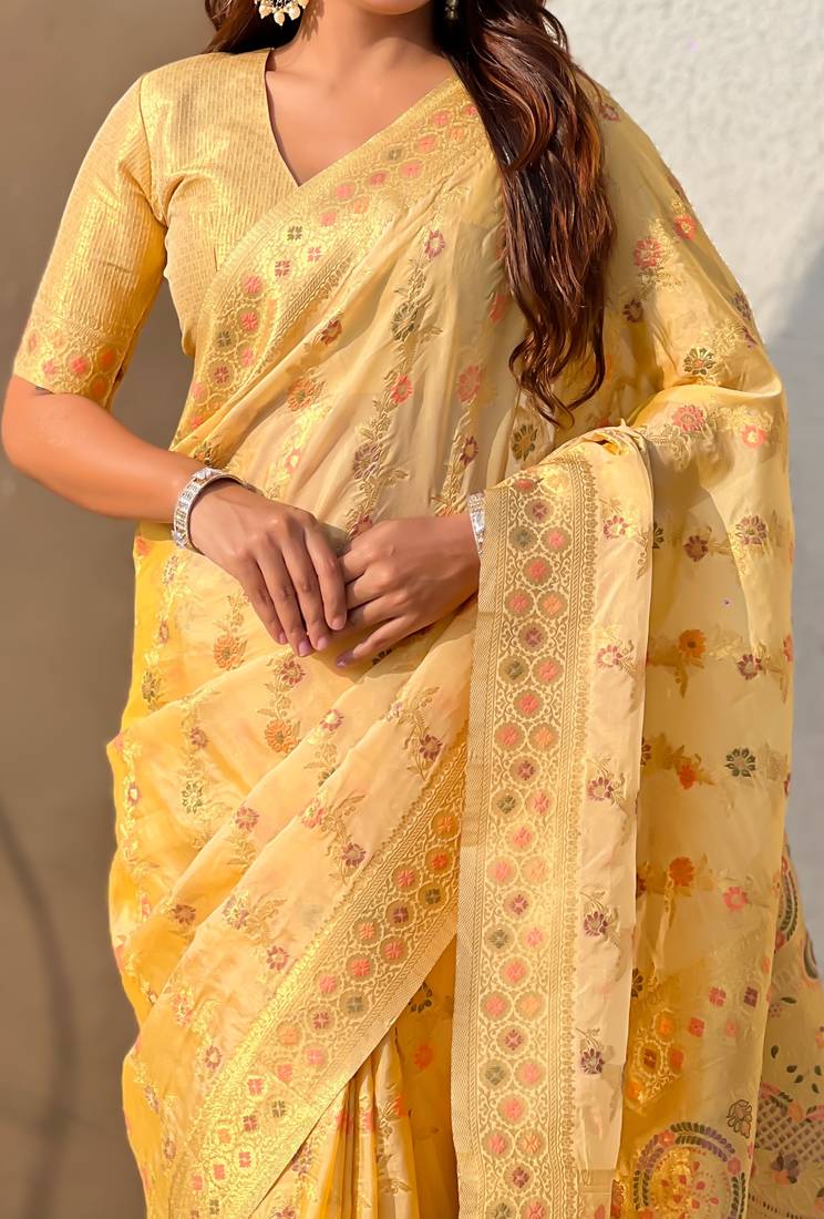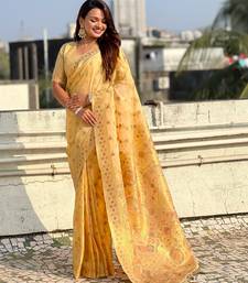 Gold woven zari floral & traditional motifs work silk blend fabric traditional festive style