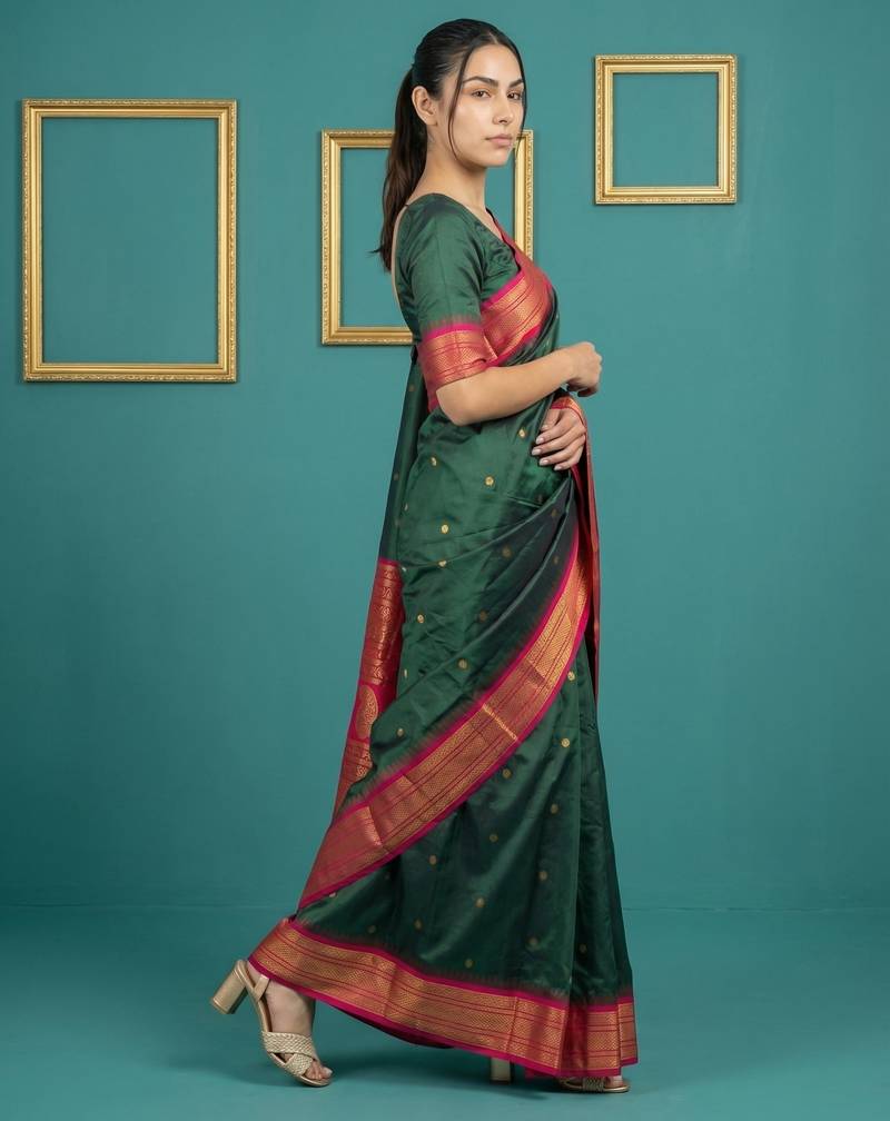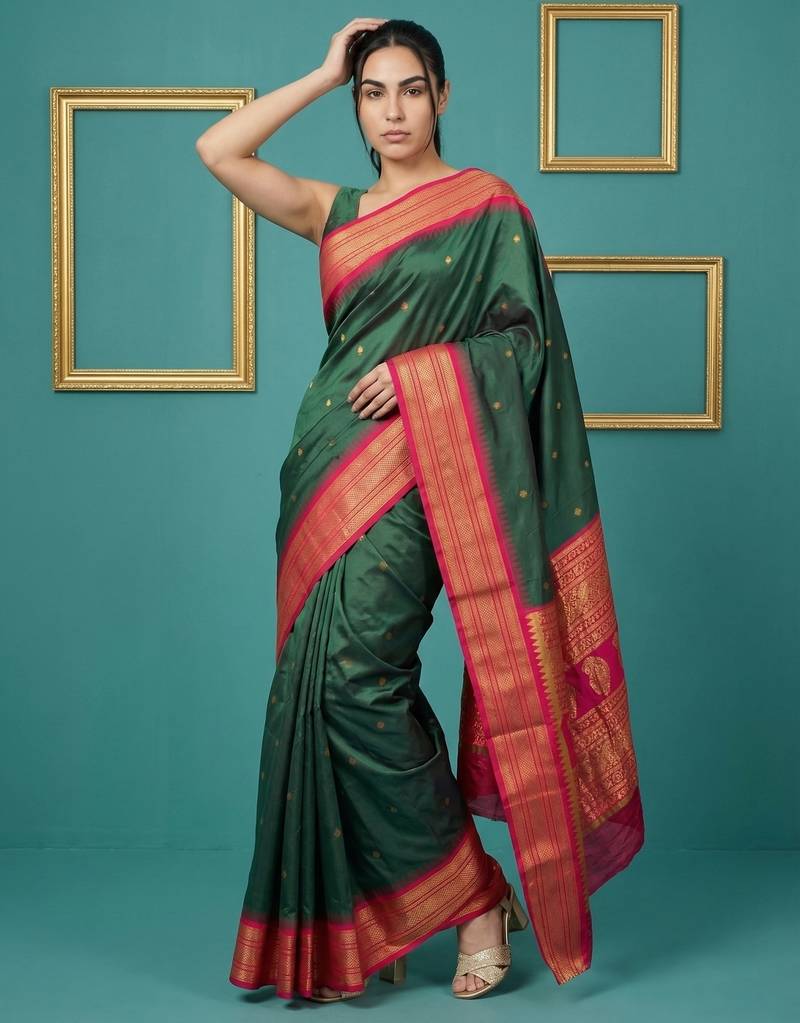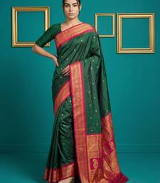 Green border woven zari border & buti work silk blend fabric traditional festive style