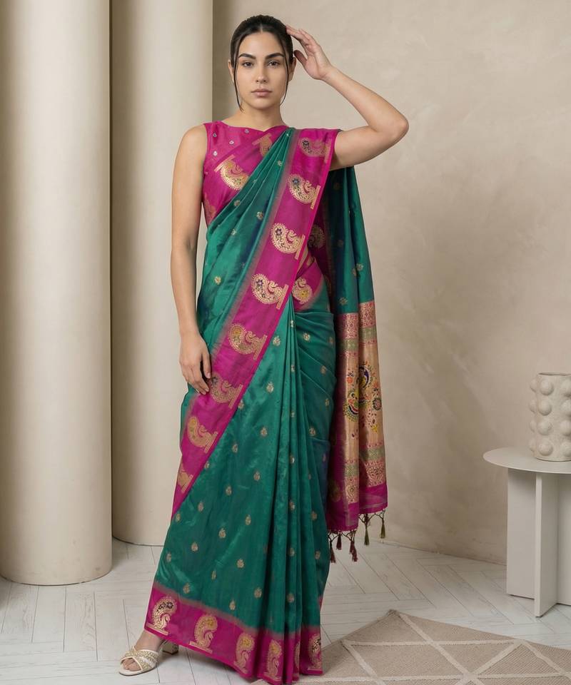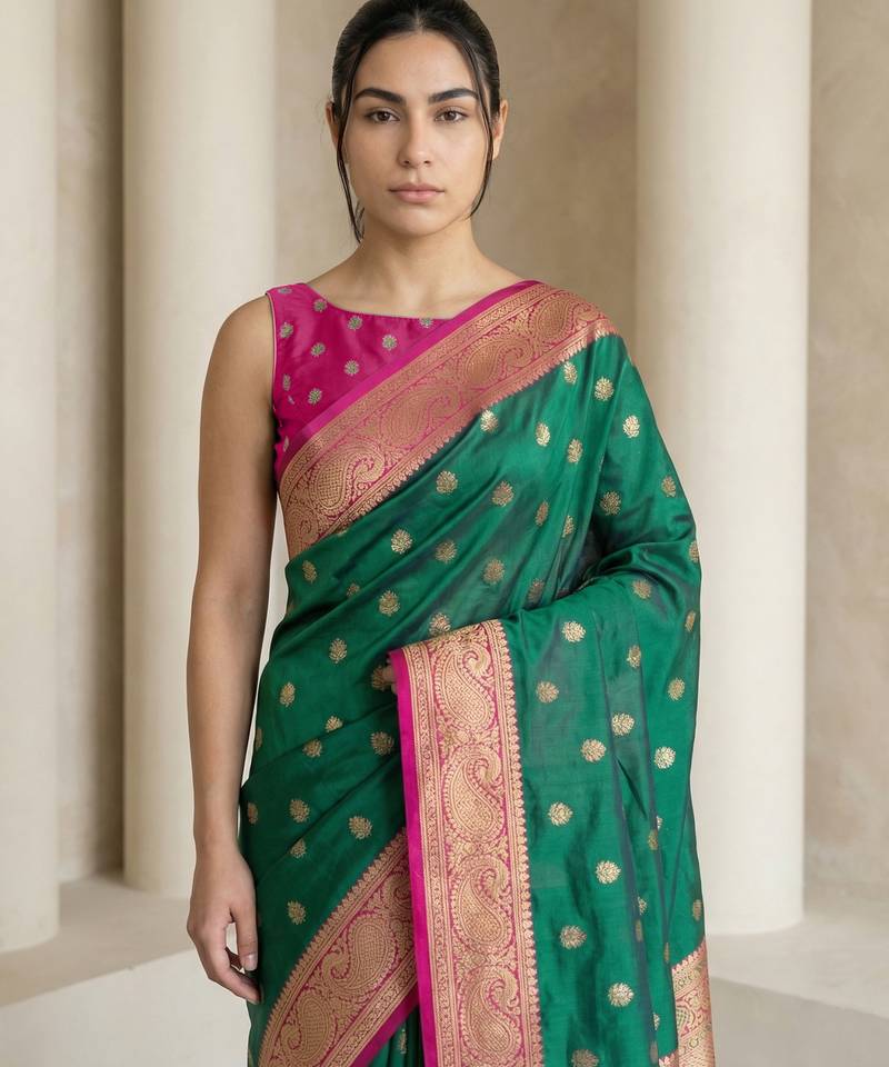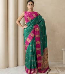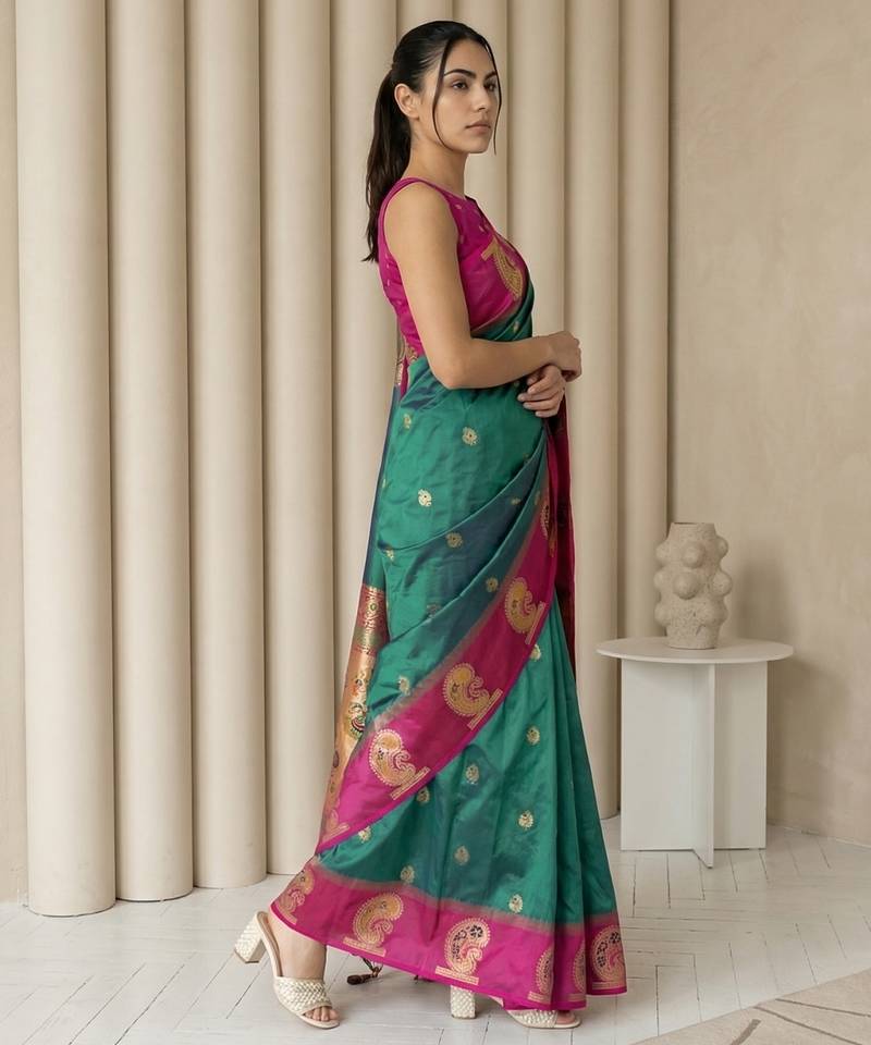 Green gold paisley zari motifs rich silk blend fabric elegant festive & wedding wear contrast border