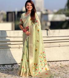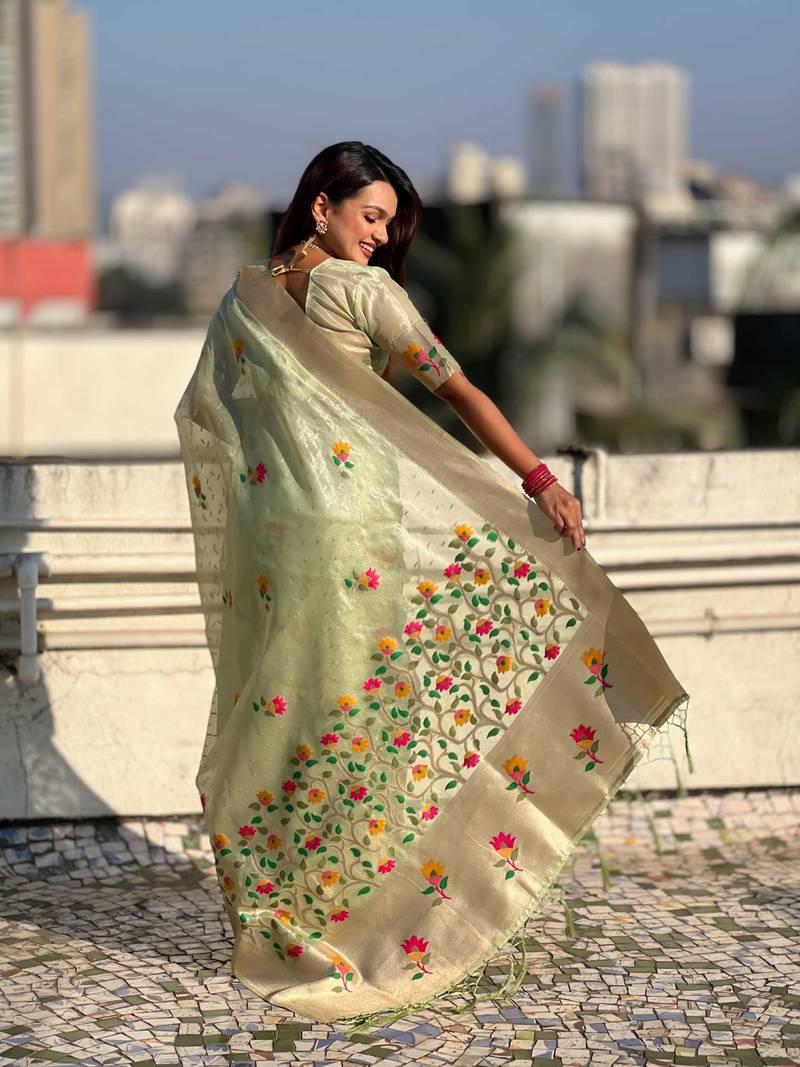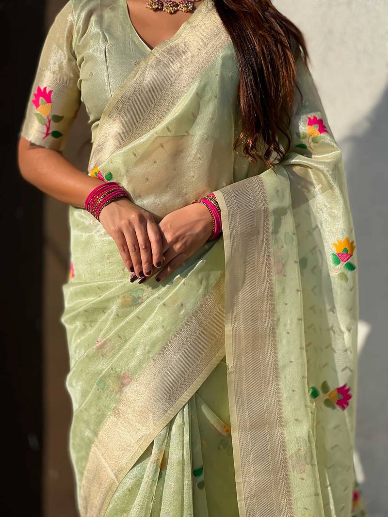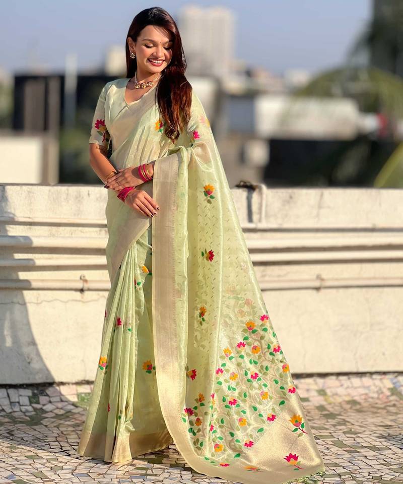 Green with multicolor accents woven zari floral motifs work paithani style saree with blouse piece