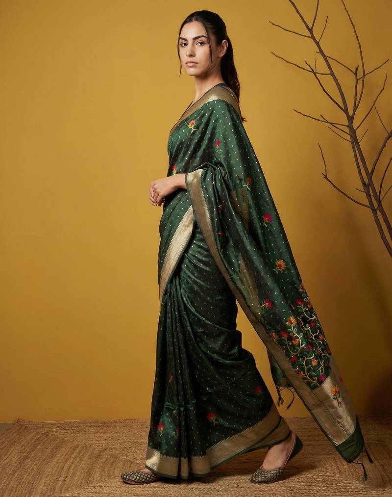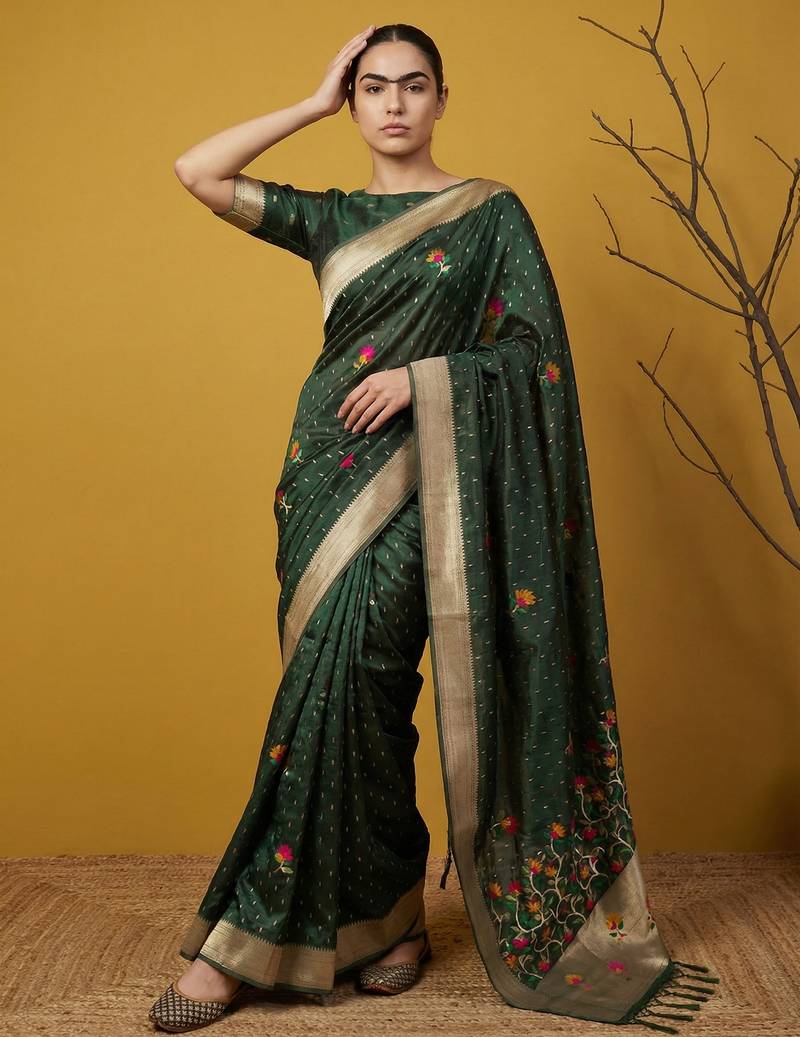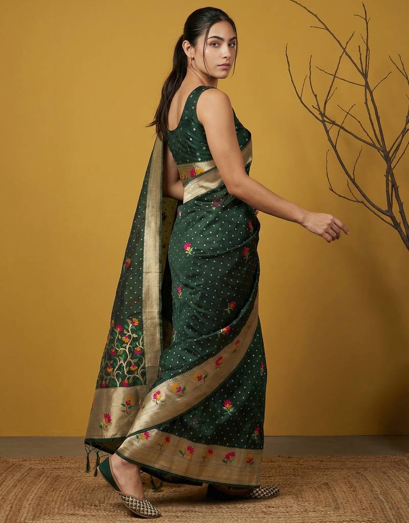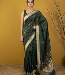Green with multicolor accents woven zari small buti & floral border work silk blend