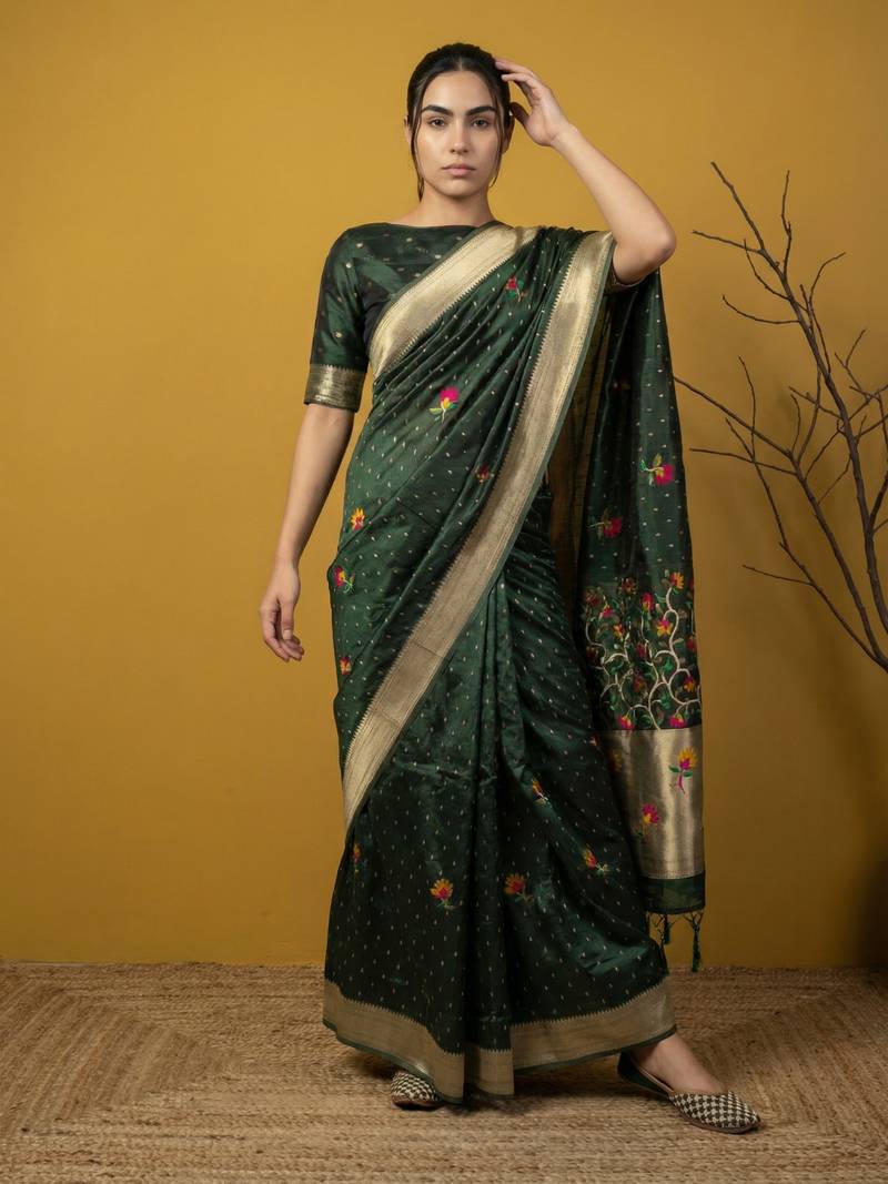 | Product Name | Green With Multicolor Accents Woven Zari Small Buti & Floral Border Work Silk Blend | |