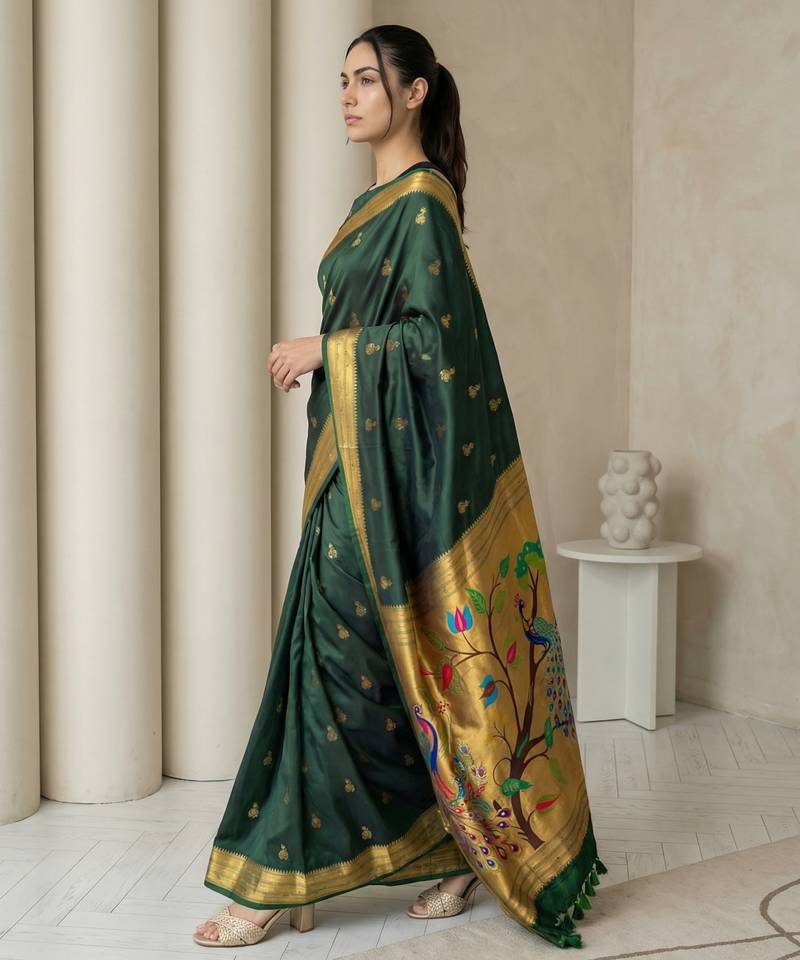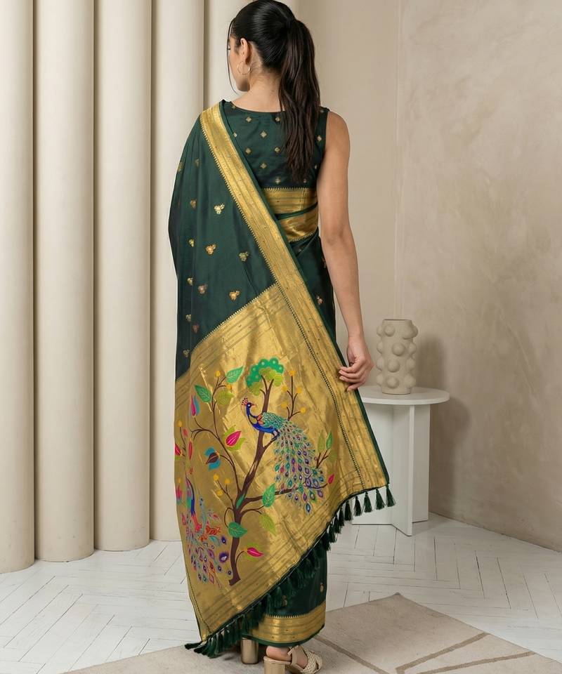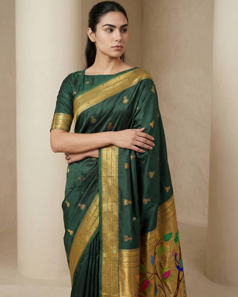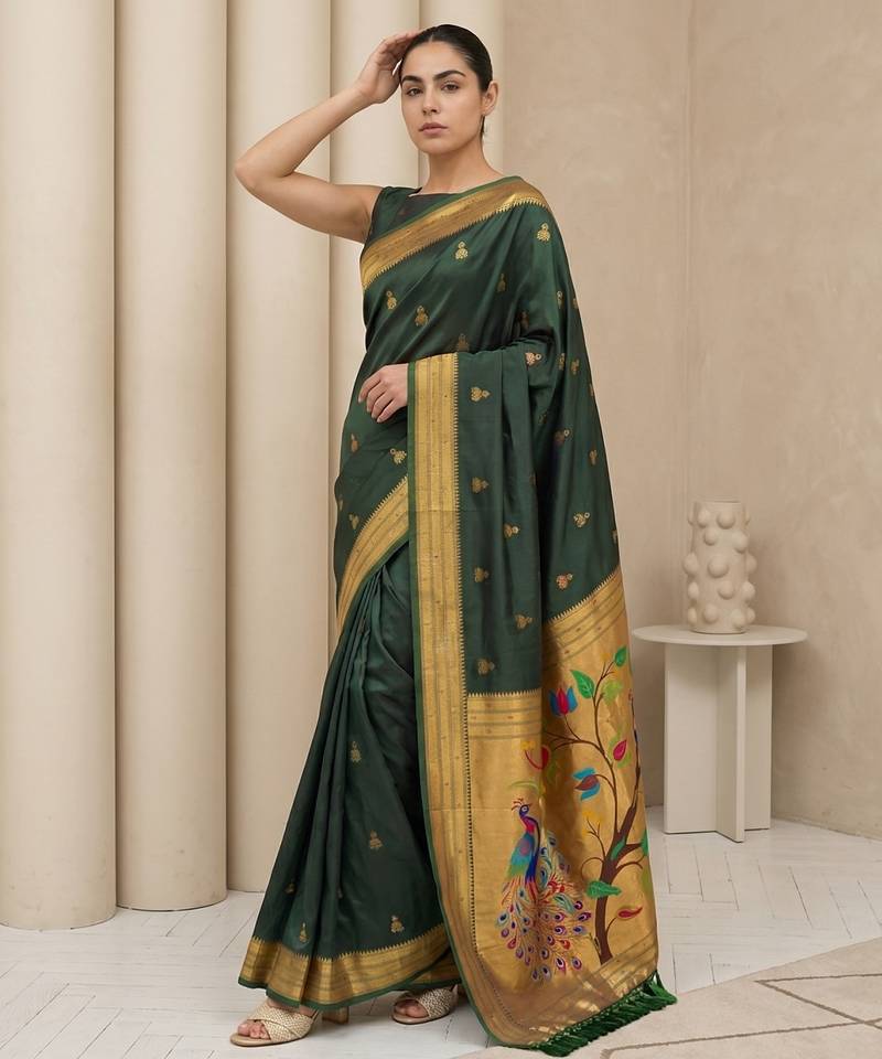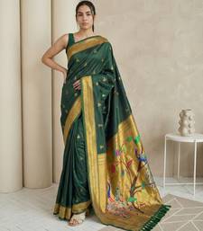 Green woven zari buti & peacock pallu work silk blend fabric traditional festive style paithani style saree