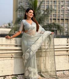 Grey thread embroidery floral work organza elegant party wear style designer saree with blouse piece