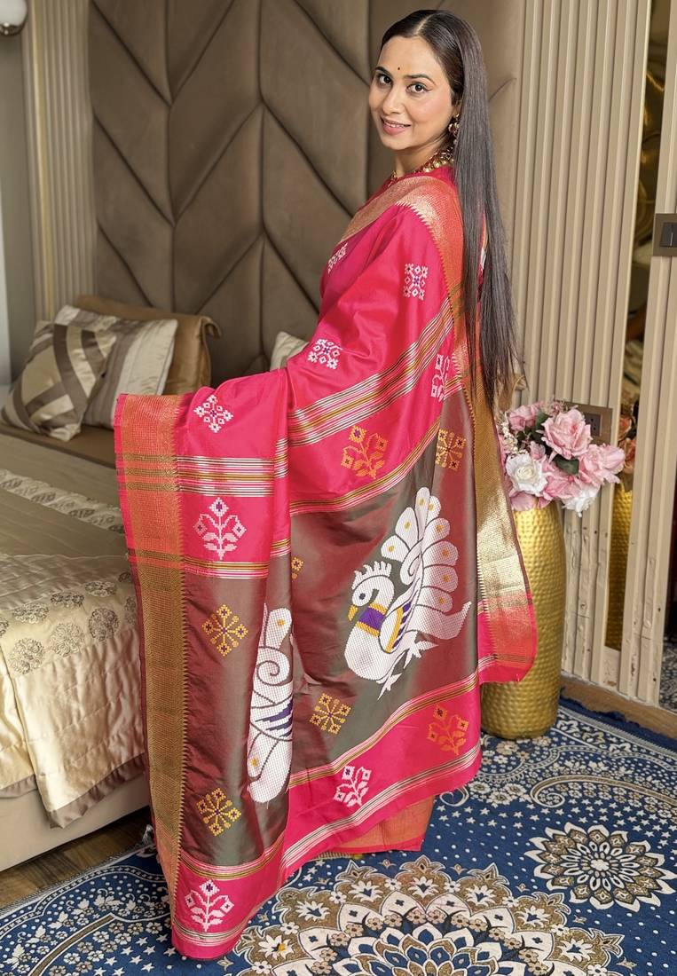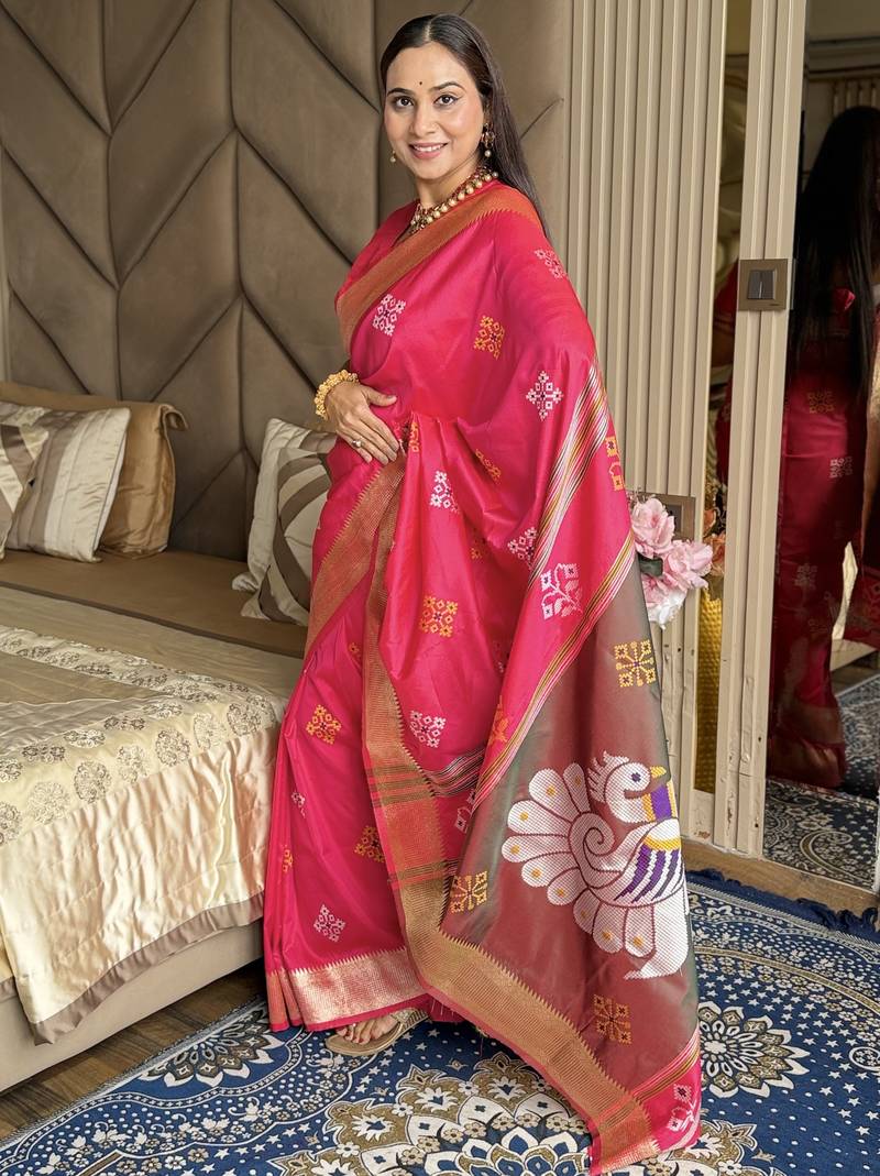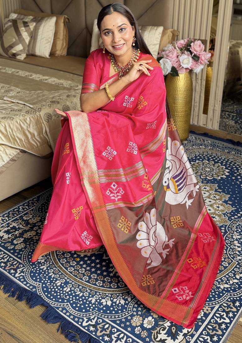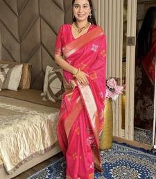 Hot pink woven zari buti & peacock pallu work silk blend fabric traditional festive style paithani style saree