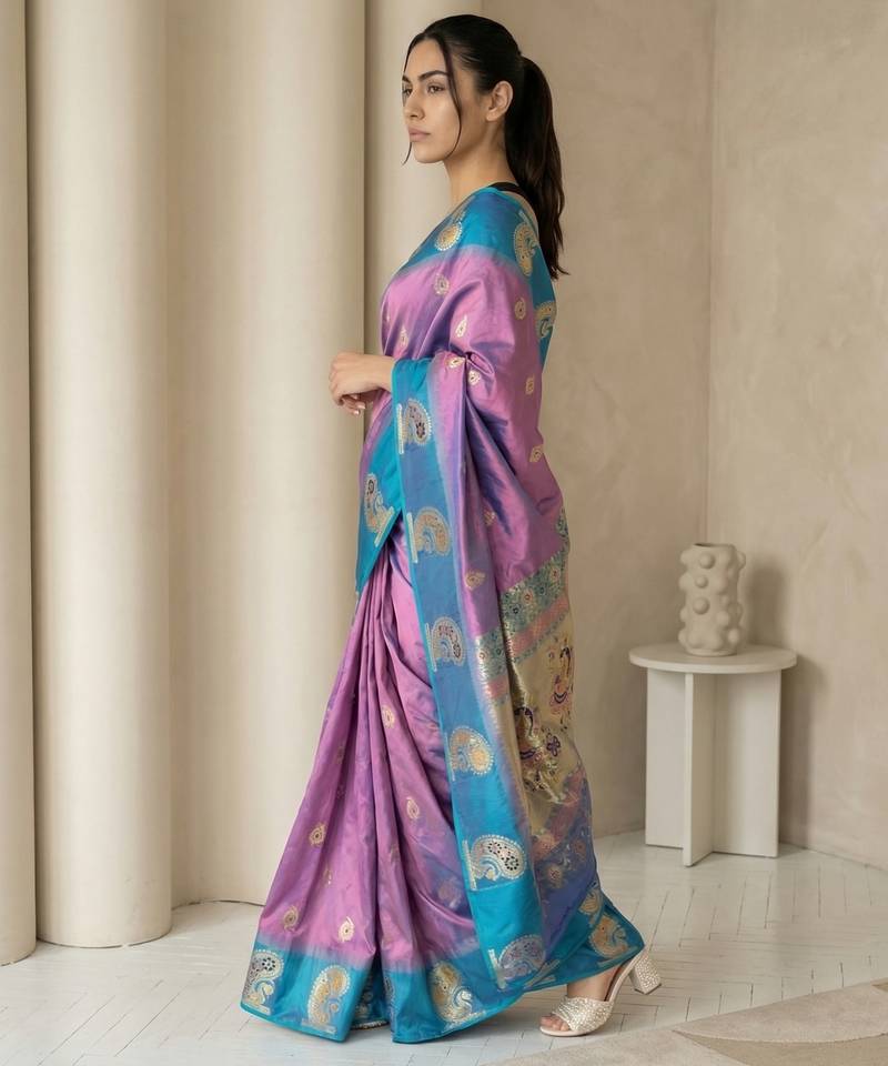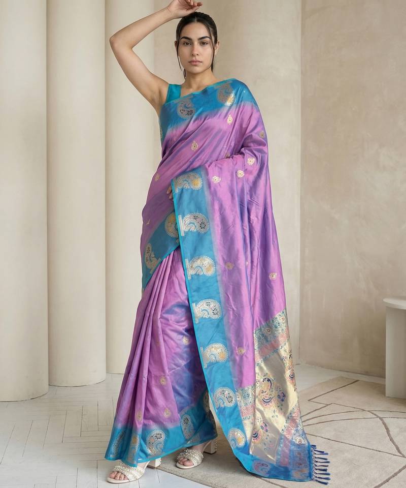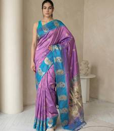 Lavender gold paisley zari motifs rich silk blend fabric elegant festive & wedding wear contrast border