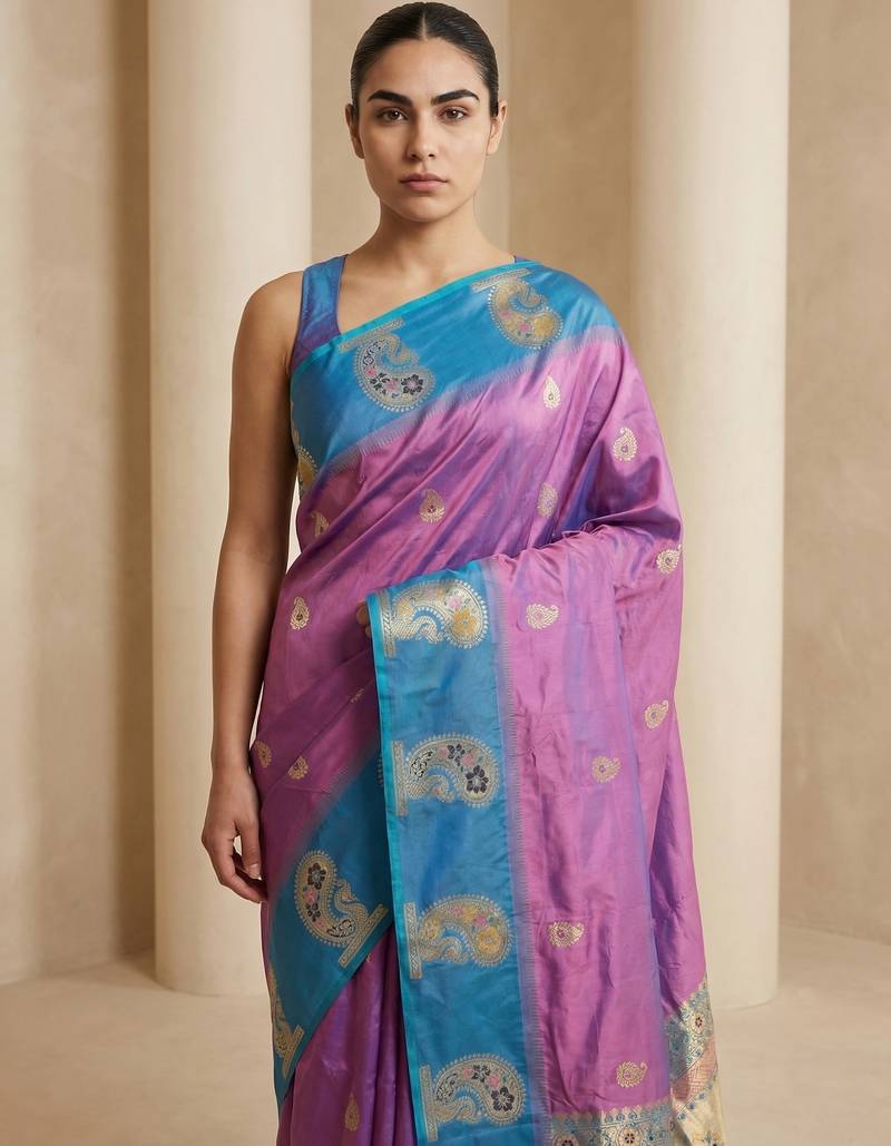 | Product Name | Lavender Gold Paisley Zari Motifs Rich Silk Blend Fabric Elegant Festive & Wedding Wear Contrast Border | |
