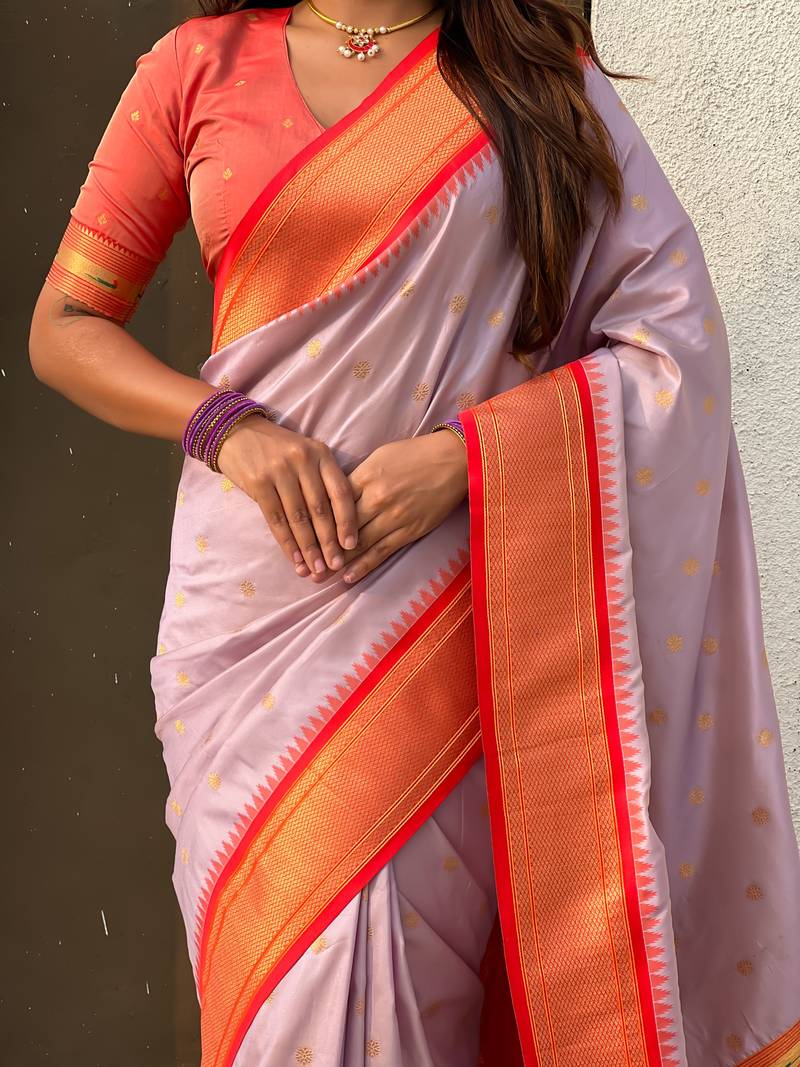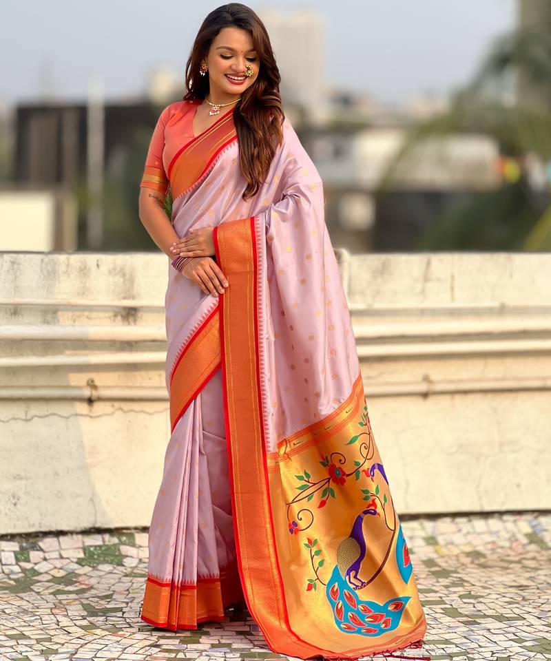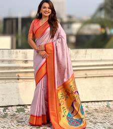 Lavender-lavender silk blend saree with orange zari border & peacock printed pallu | festive traditional wear saree