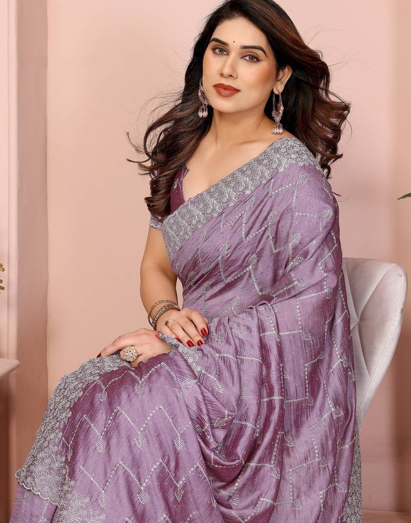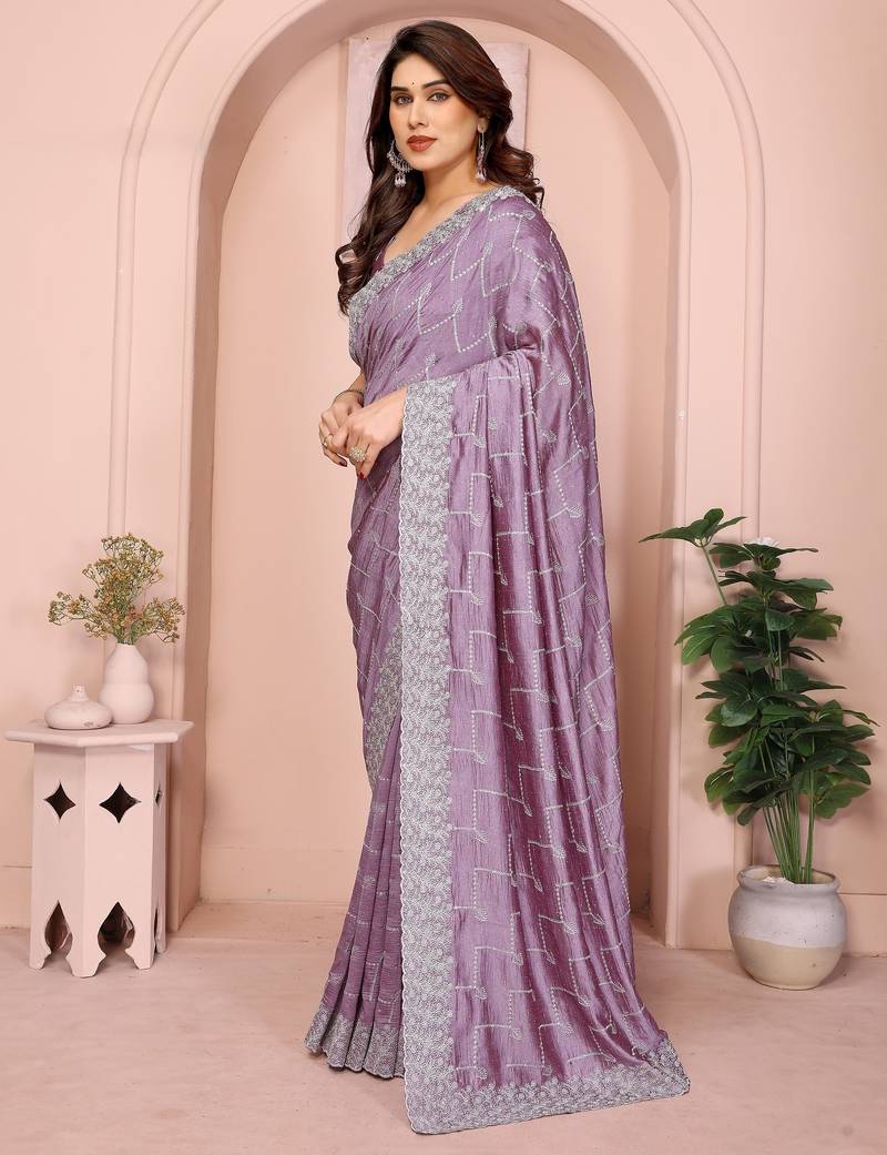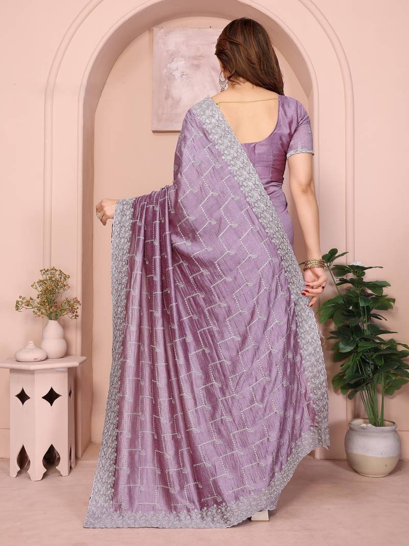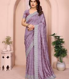 Lavender vichitra silk saree with sequence embroidery work and matching blouse piece