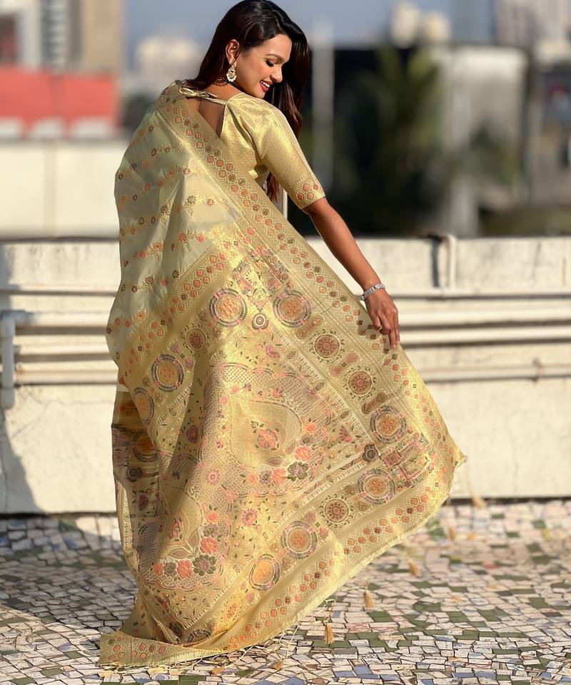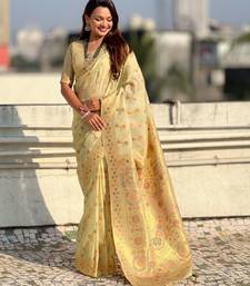 Light gold woven zari floral & traditional motifs work silk blend fabric traditional festive style