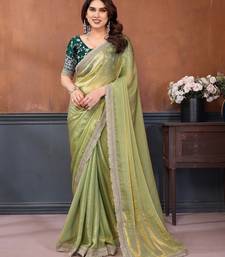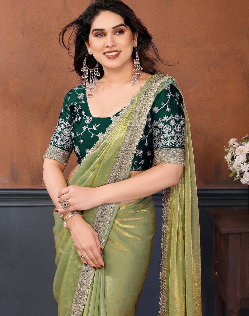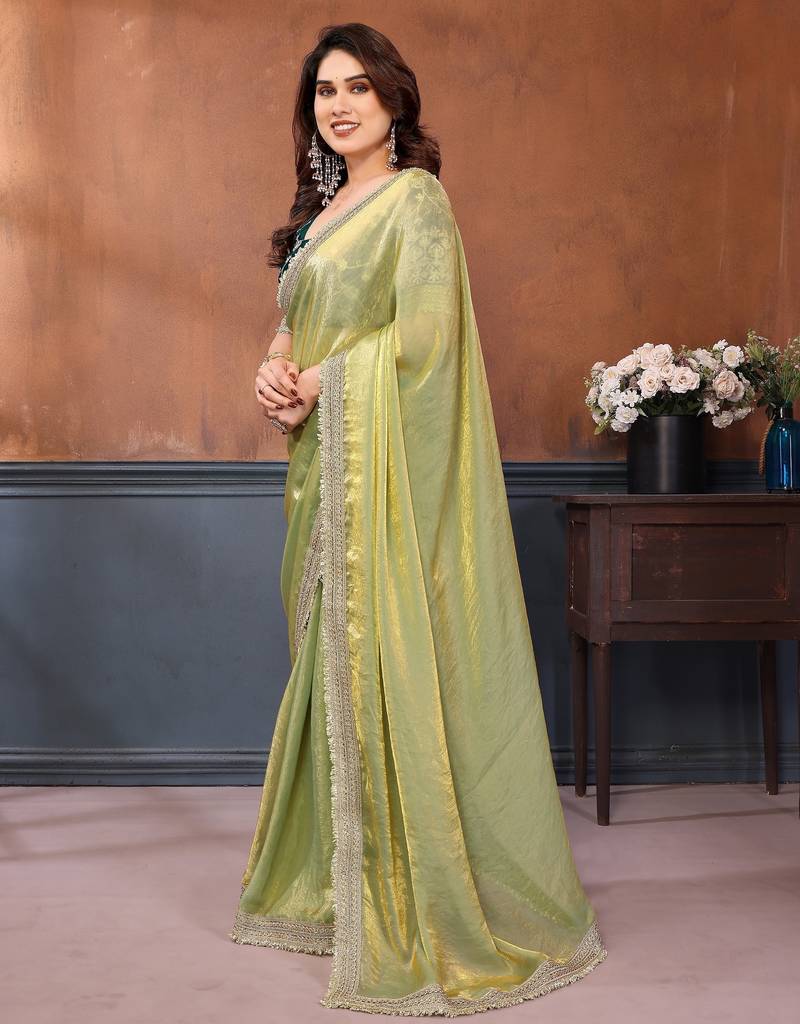 Light green fandy satin saree with embroidered lace border and matching blouse piece