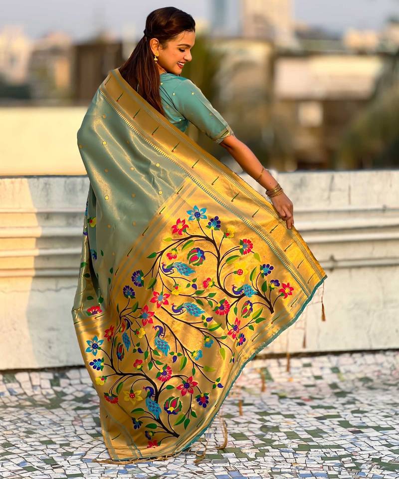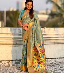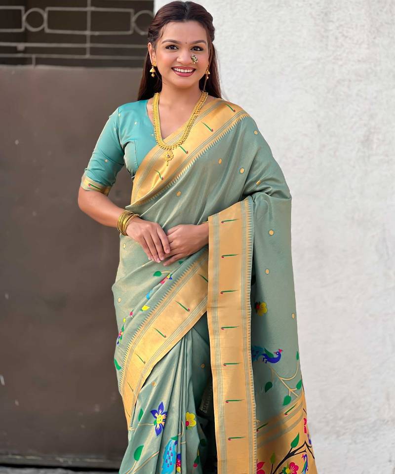 Light green with multicolor accents woven zari floral & peacock motifs silk blend