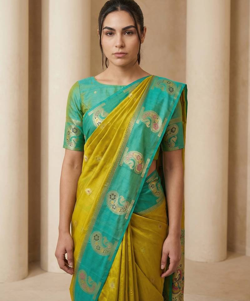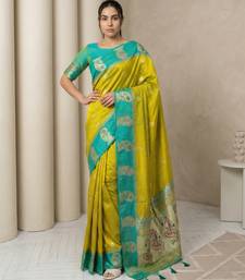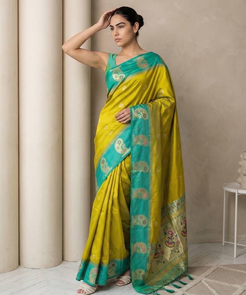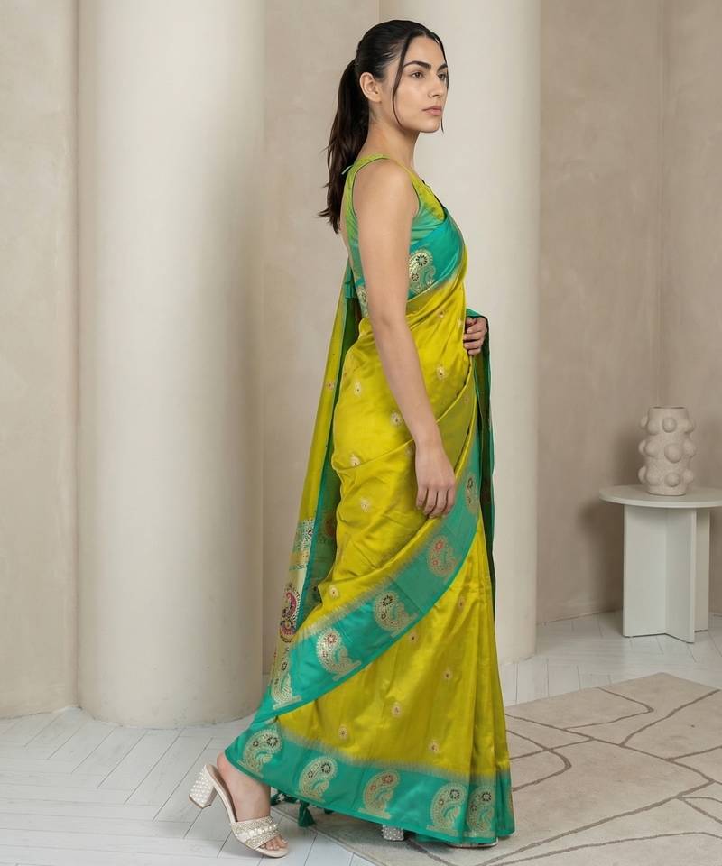 Light lime gold paisley zari motifs rich silk blend fabric elegant festive & wedding wear contrast border