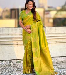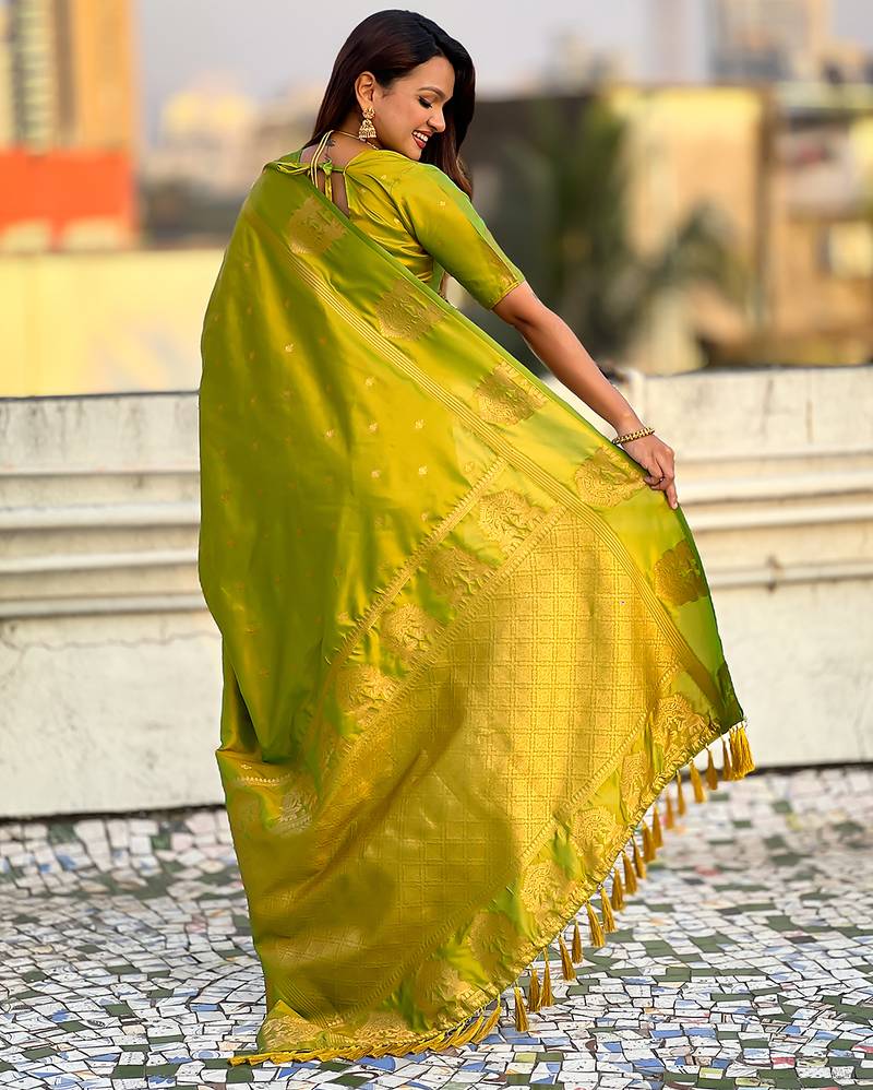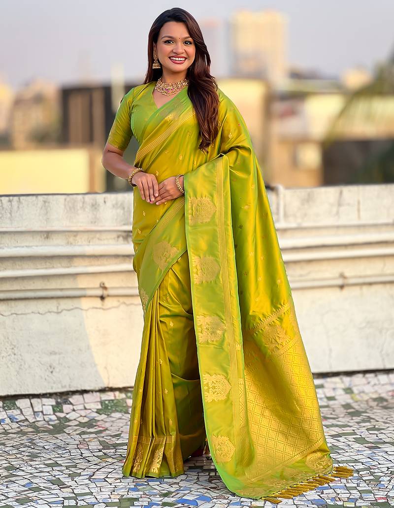 Light lime silk blend saree with golden zari motifs & rili woven pallu | tliditional festive wear saree