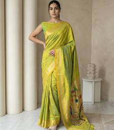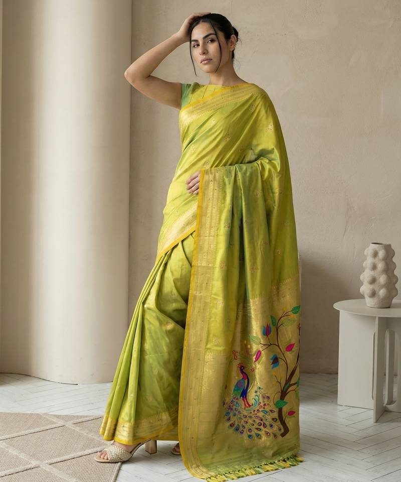 Light lime woven zari buti & peacock pallu work silk blend fabric traditional festive style paithani style saree
