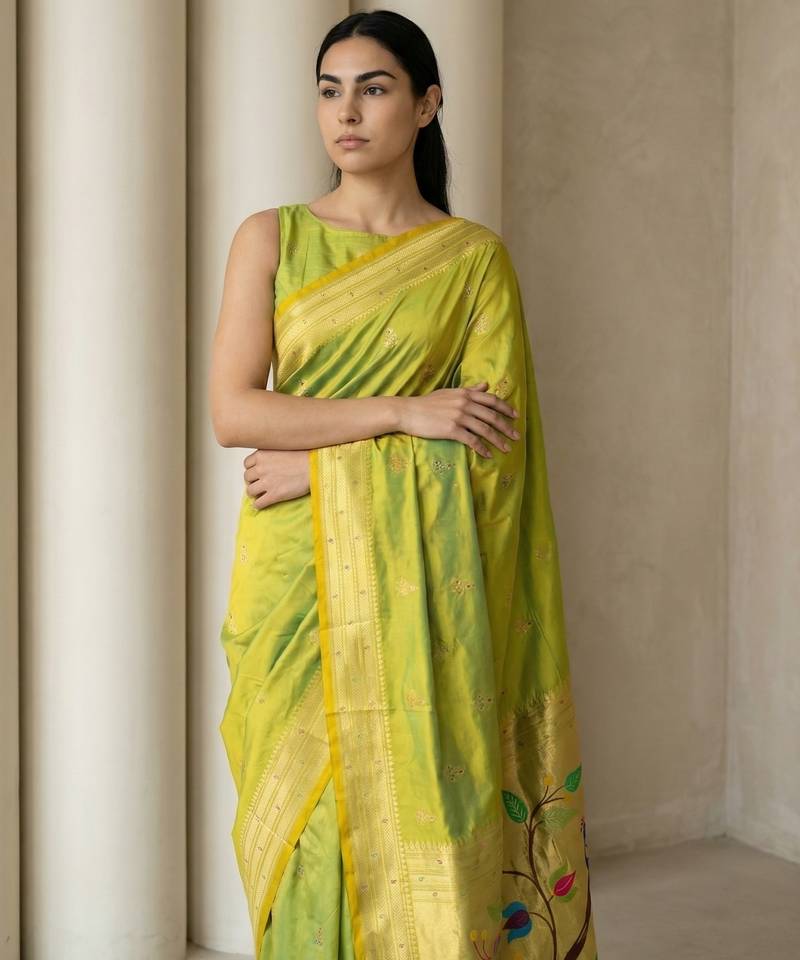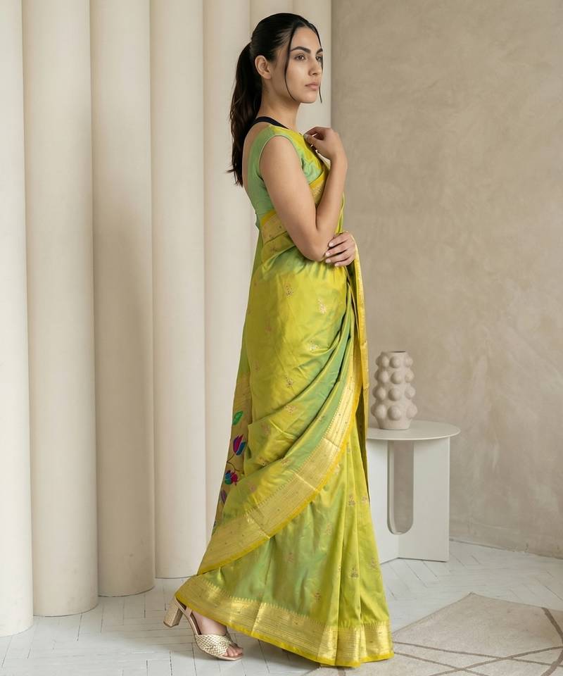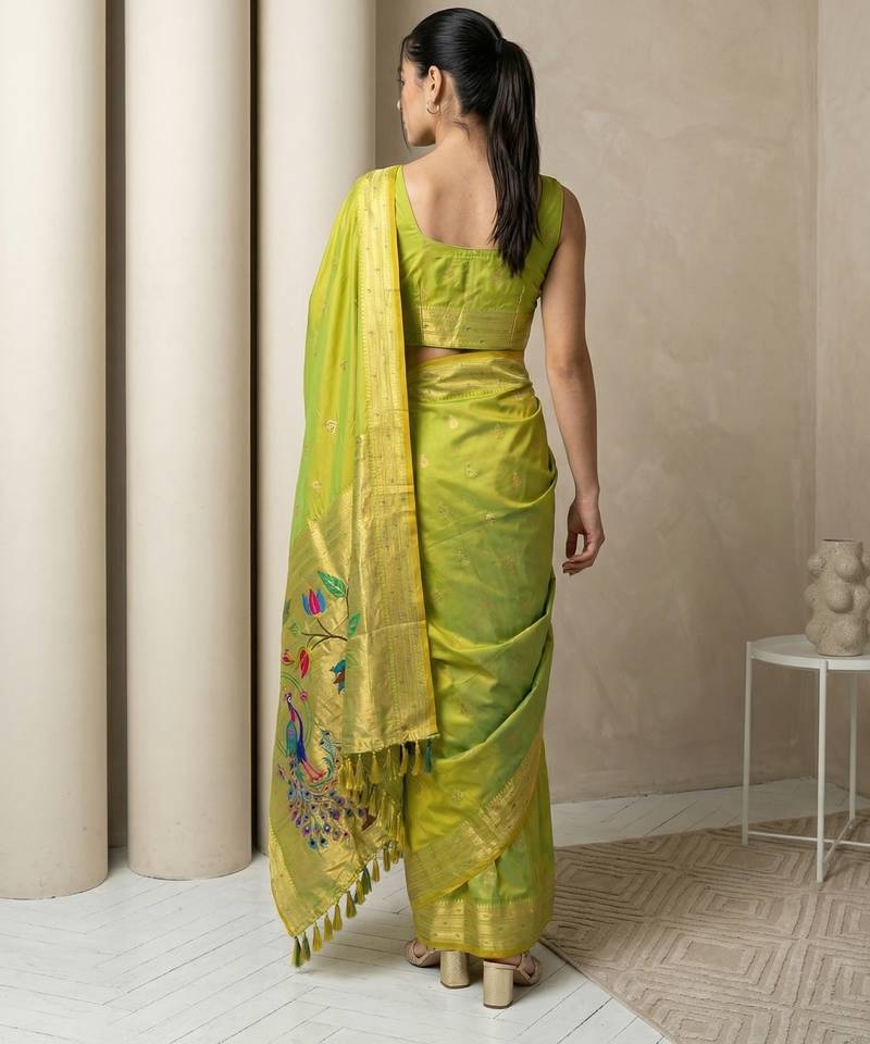 | Product Name | Light Lime Woven Zari Buti & Peacock Pallu Work Silk Blend Fabric Traditional Festive Style Paithani Style Saree | |