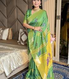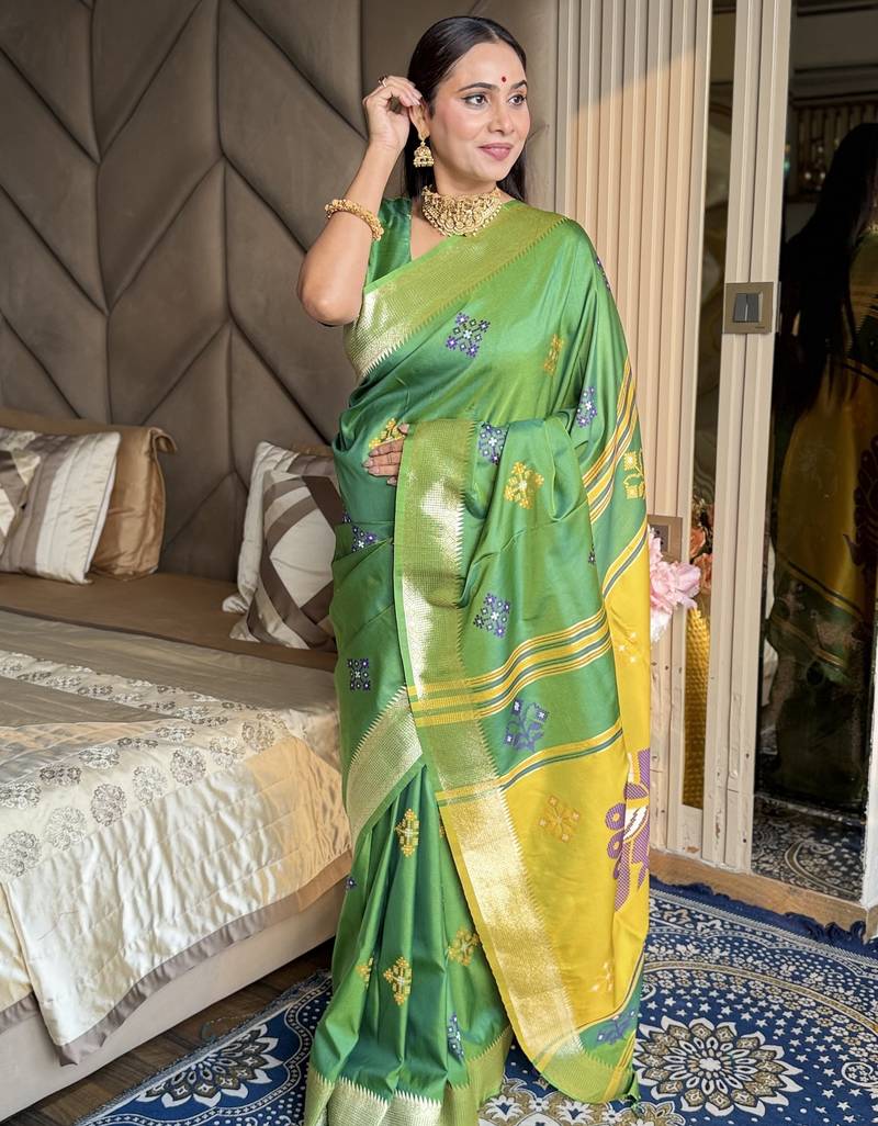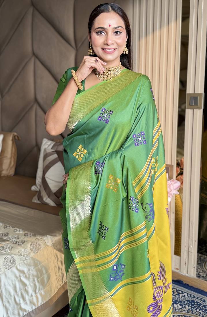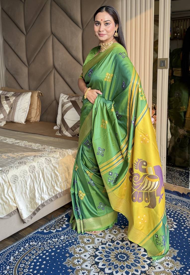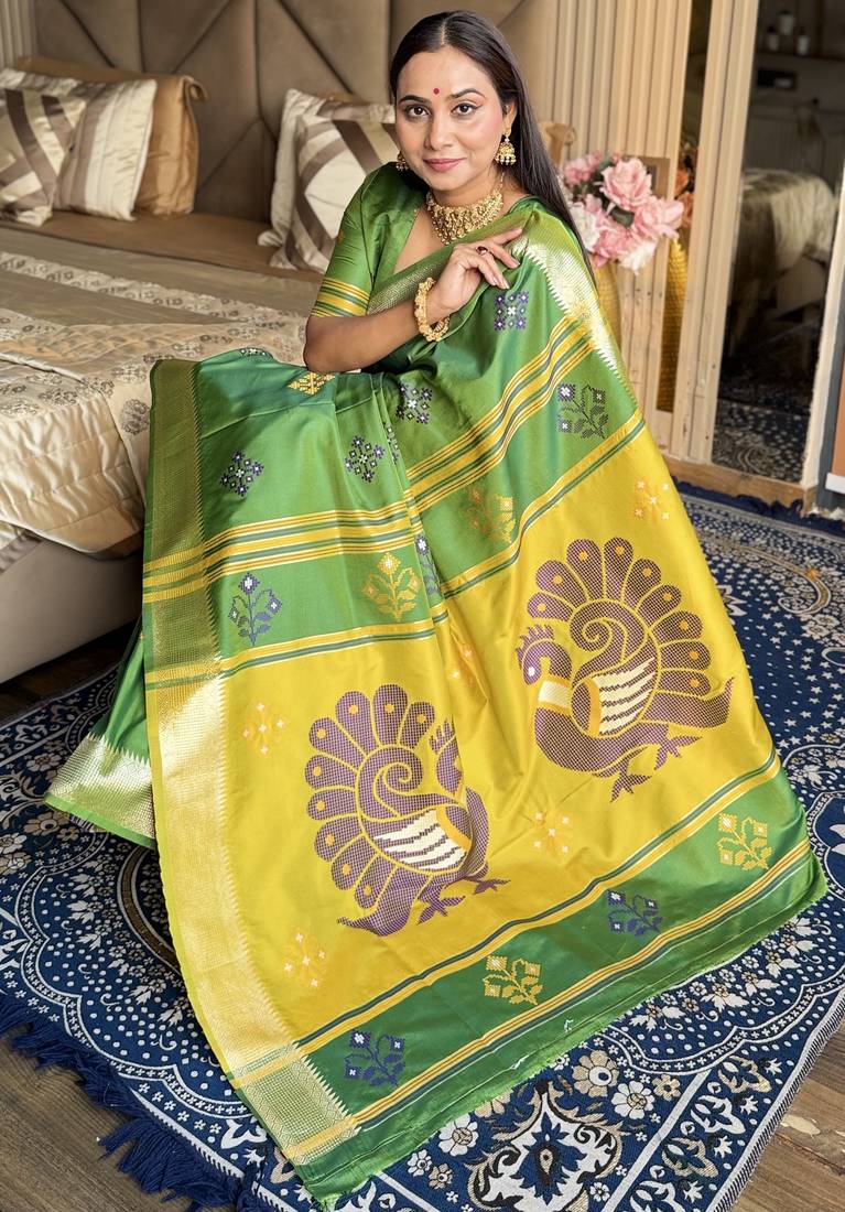 Light lime woven zari buti & peacock pallu work silk blend fabric traditional festive style paithani style saree