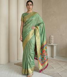 Light olive pallu woven zari buti & traditional motifs work silk blend fabric traditional festive style