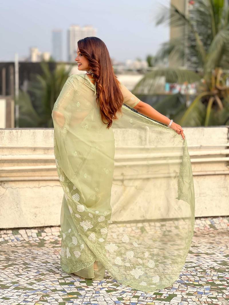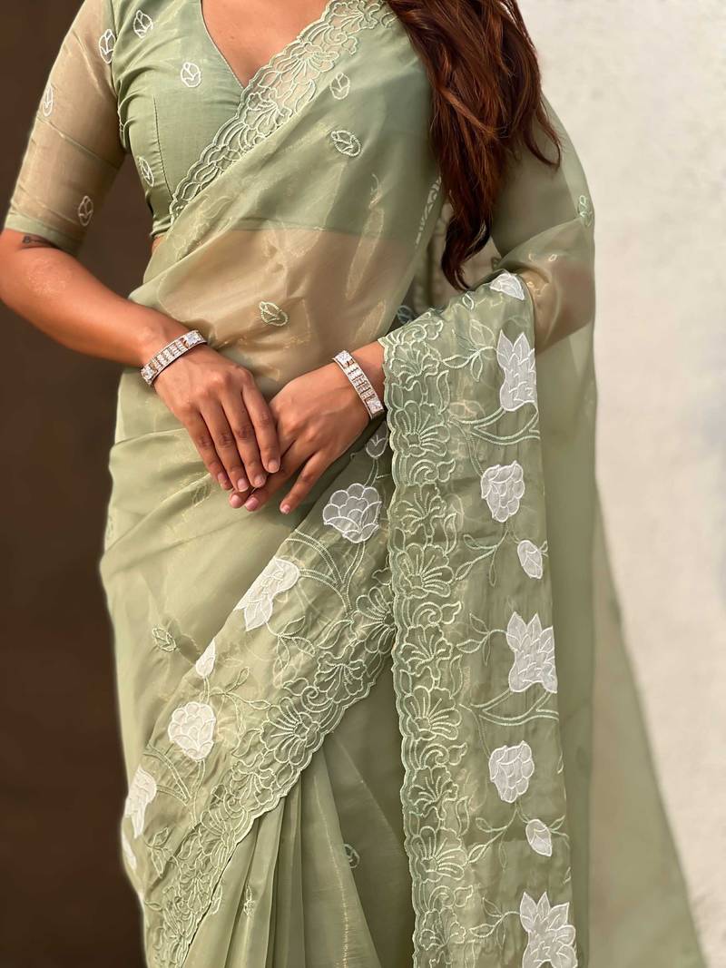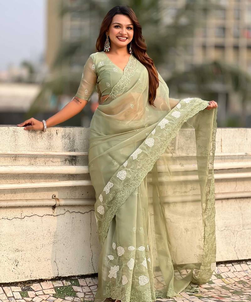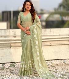Light olive thread embroidery floral work organza party wear elegant style designer saree with blouse piece