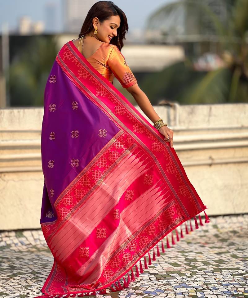 Light purple border traditional butti & geometric zari work rich woven pallu design
