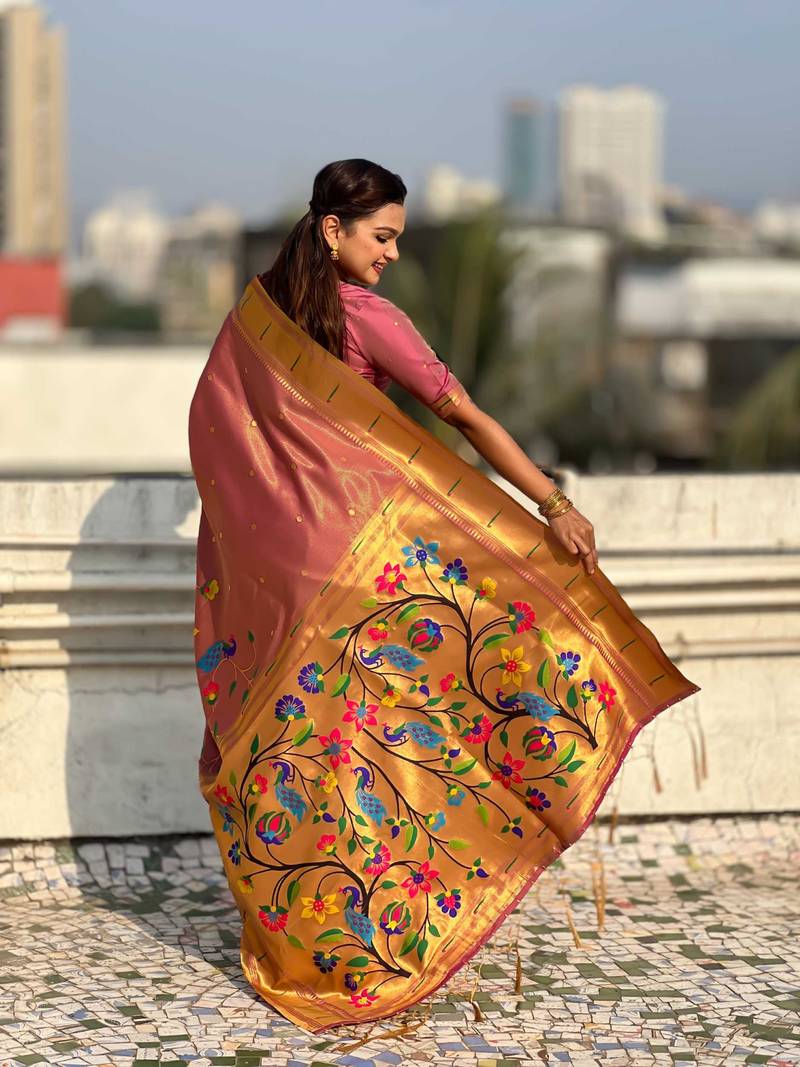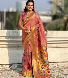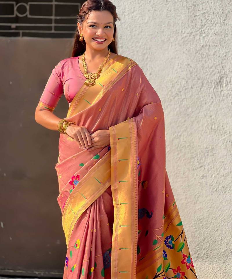 Light rose with multicolor accents woven zari floral & peacock motifs silk blend